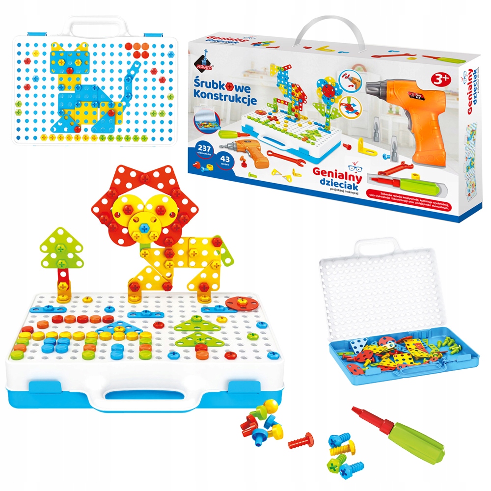 Элементы набора можно свободно комбинировать, завинчивать и выкручивать, а узоры можно многократно менять с помощью дрели. Играть можно в самолете и в космосе.