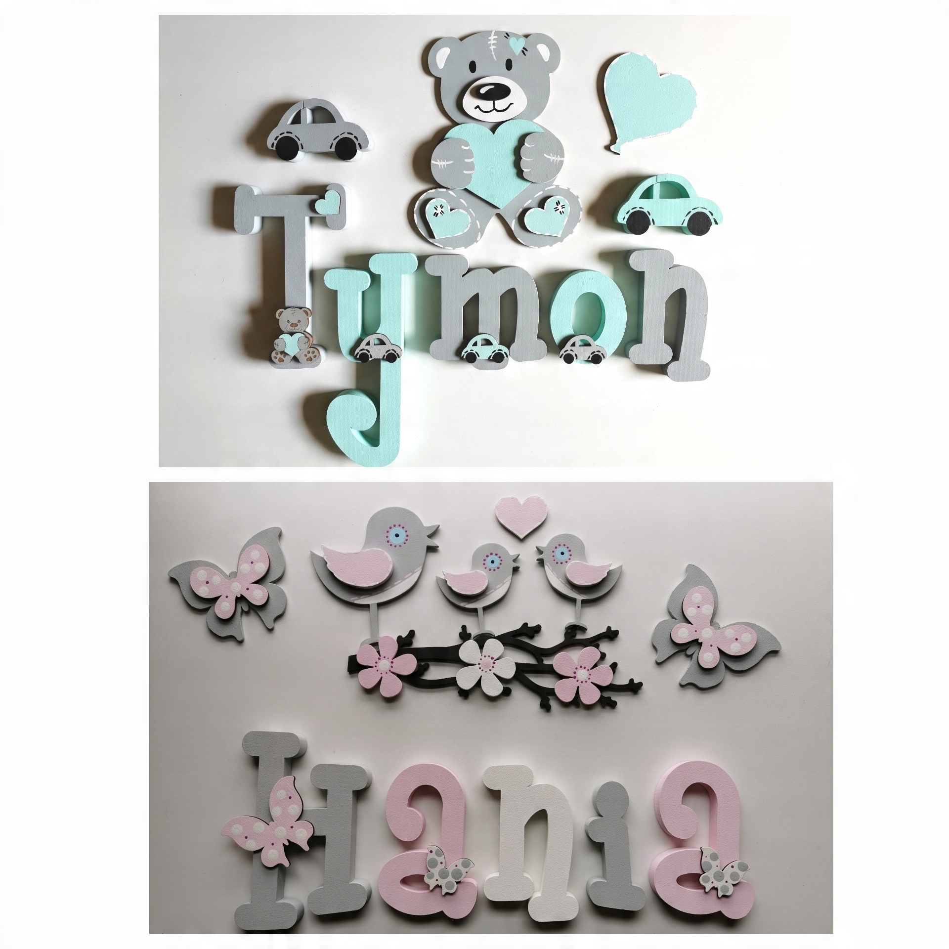 Предметы продажи красивые, расписанные вручную и украшенные нежным фанерным декором-буквами, из которых можно составить имя вашего ребенка.