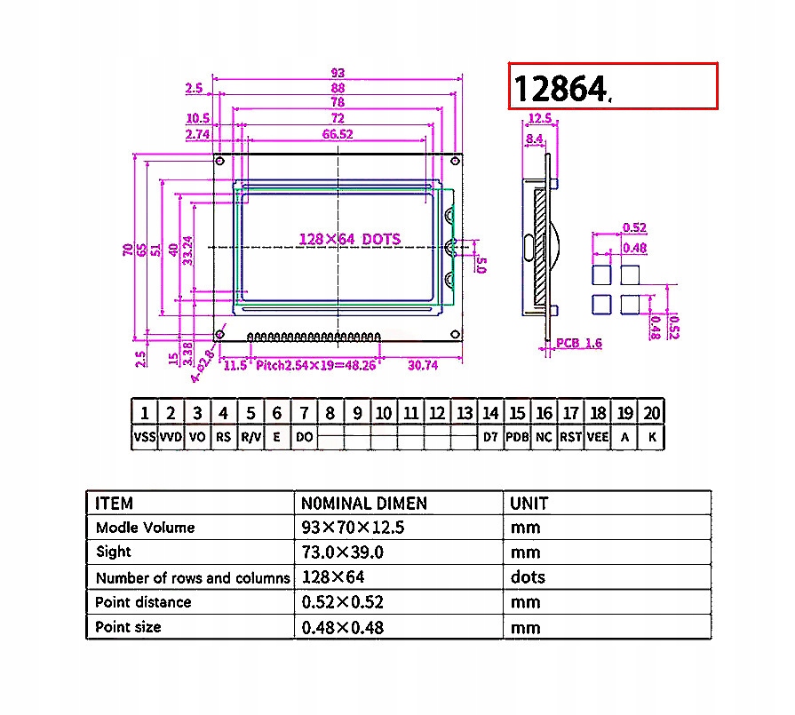 На рисунках ниже показаны размеры предлагаемого модуля дисплея.