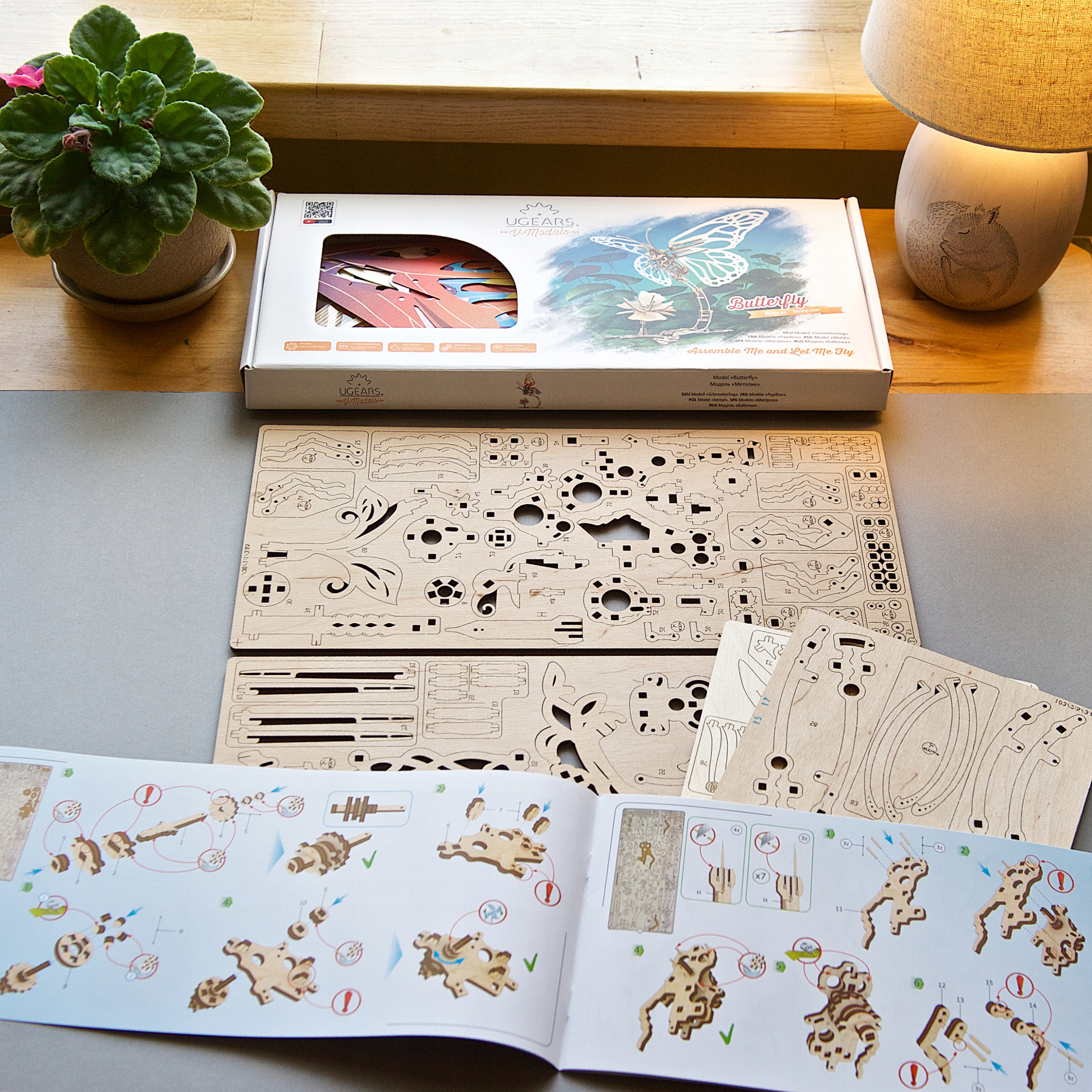 Как и все модели Ugears, при сборке «Бабочки» не используется клей, дополнительные инструменты или оборудование. Модель собирается из готовых элементов, вырезанных лазерным методом из фанеры из натуральных древесных материалов. После нажатия готовые к установке детали можно легко снять с платы.