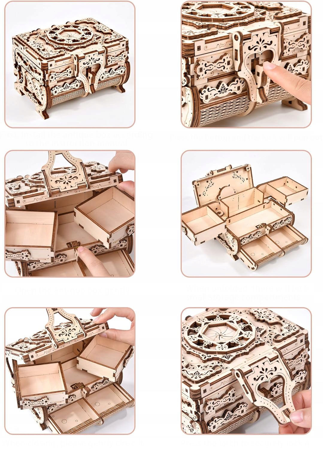 • Как и другие механические игрушки и наборы для сборки моделей для взрослых, эта старинная шкатулка оснащена интересным механизмом открытия с шестью отделениями.