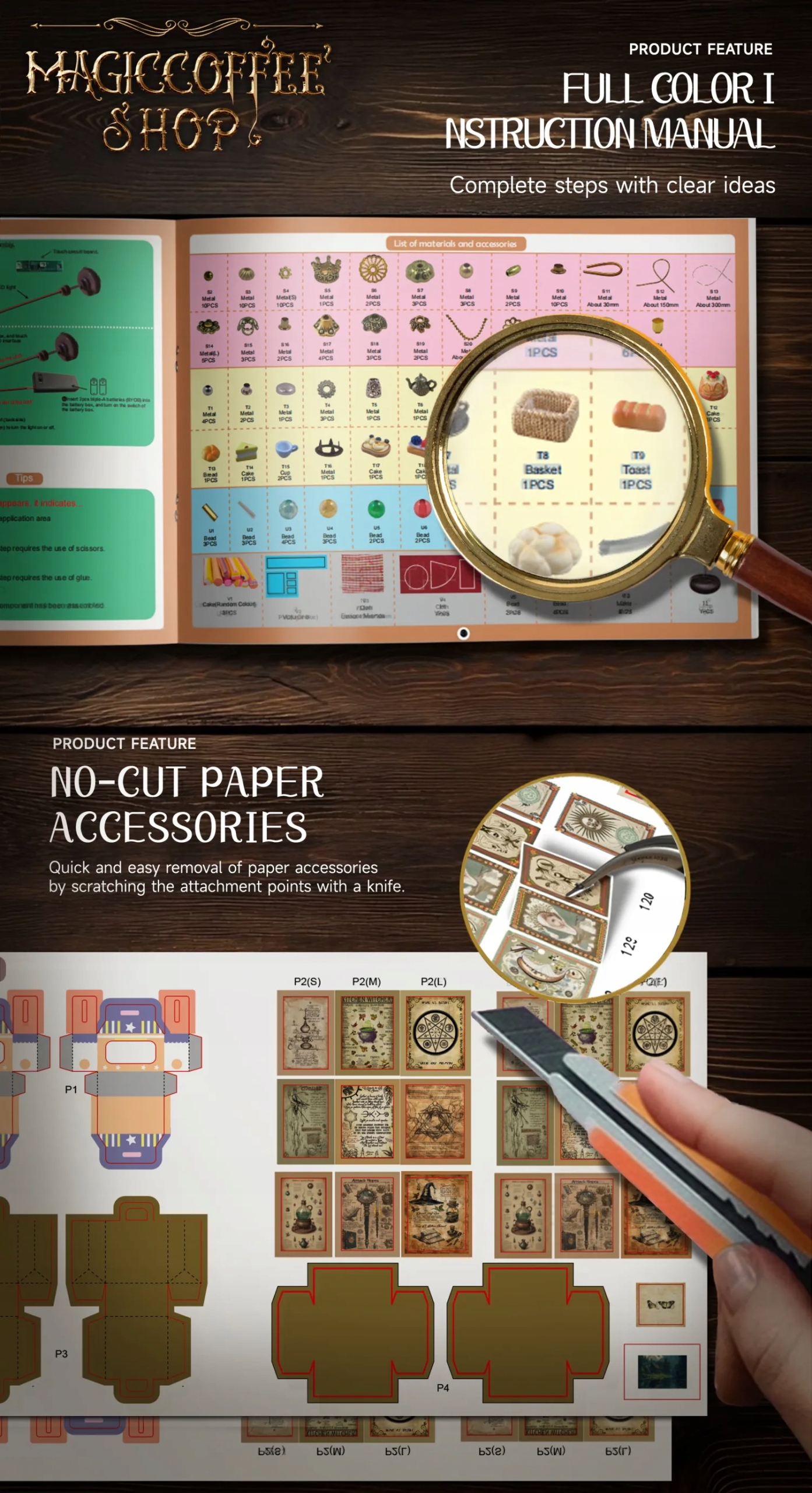 В миниатюрном волшебном кафе представлены изящно вырезанные рамы магазинов, полы, шкафы и витрины для тортов, дополненные яркими акриловыми бусинами, создающими ослепительные бутылочки с зельями и палочки в теплой, волшебной атмосфере.