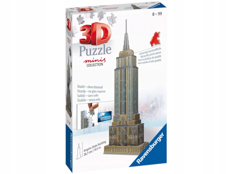 Пазлы Ravensburger помогут вашему ребенку развить ценные навыки, такие как логическое мышление, проницательность и терпение. Став взрослым, вы также сможете насладиться качеством и мастерством изготовления головоломок Ravensburger. Набор содержит целых 54 элемента, которые вместе создают трехмерную модель Эмипре Стейт Билдинг. Кроме того, элементы изготовлены из жесткого пластика, благодаря чему конструкция держится без использования клея. Сбор пазлов тренирует моторику, концентрацию и навыки распознавания форм.