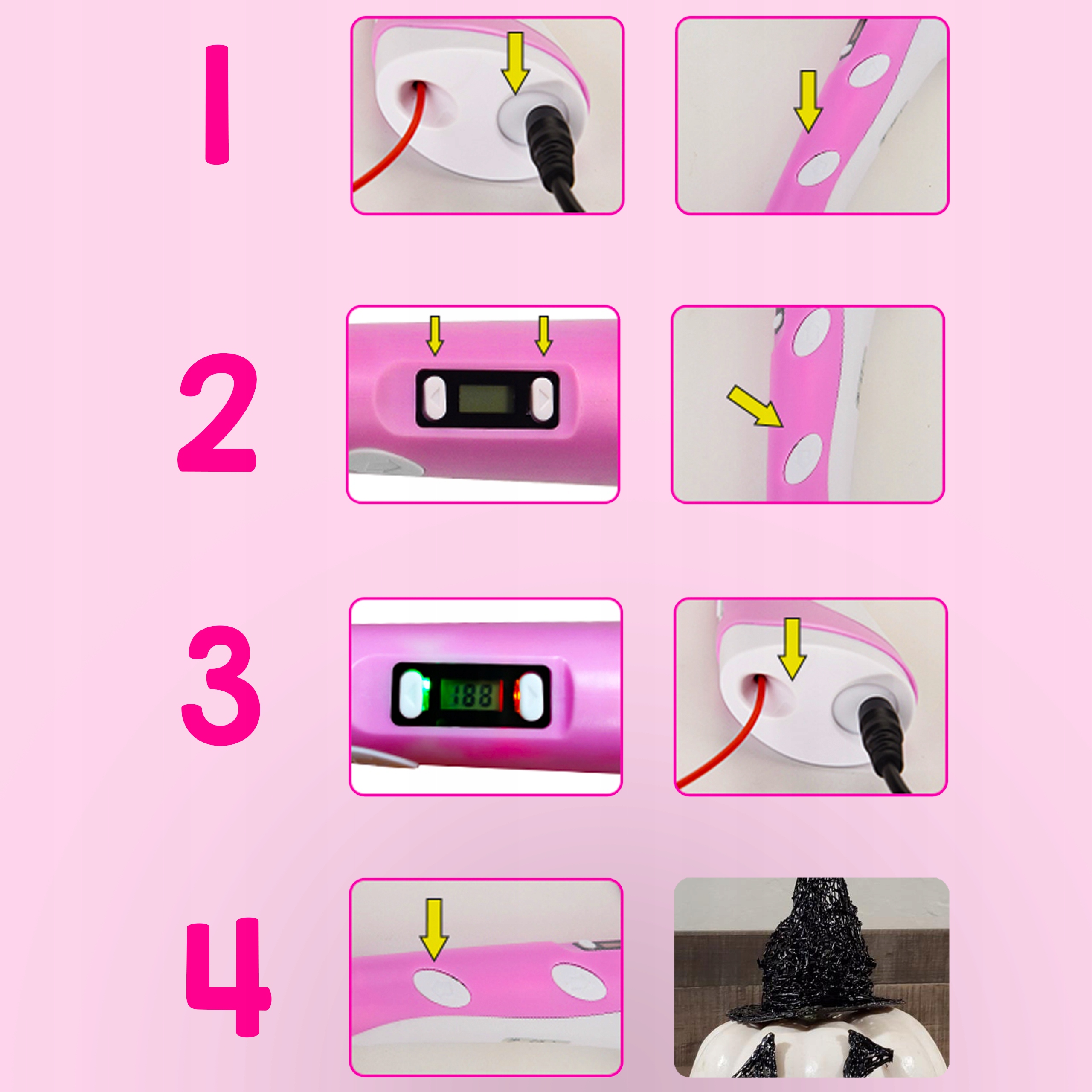 - 2,3 - Когда перо будет готово к использованию, светодиод на устройстве изменит цвет. Затем просто вставьте нить в ручку в назначенное отверстие, и можно приступать к творчеству.