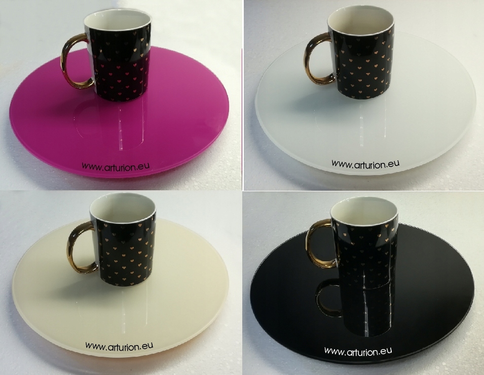 Круглая база, например, Из зеркального, черного или белого стекла лаковеля, возможных других цветов (стекло - не плексиглас!) Толщина 4 мм