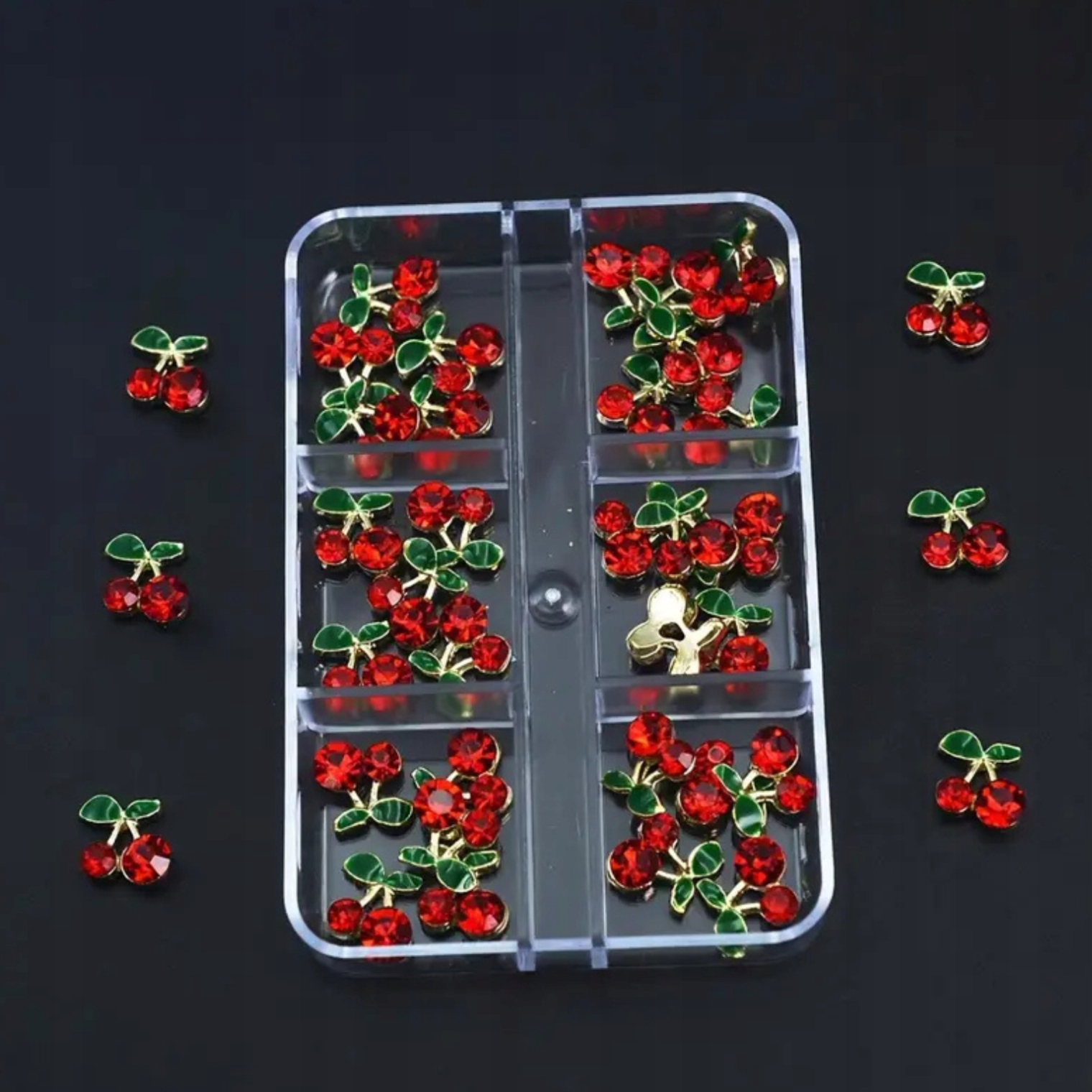 ❇ в форме миниатюрной вишневой вишни. Они объединяют винтажный климат с современной элегантностью. Их золотая металлическая основа прекрасно контрастирует с красными кристаллами, которые создают эффект сочных фруктов. Вы можете приклеить их на ногте или встроить в гелевой слой, чтобы получить впечатляющий 3D -эффект. Идеально подходит для стиля, вдохновленных рокабилли, пин-ап, ретро-ногти и мультфильма.