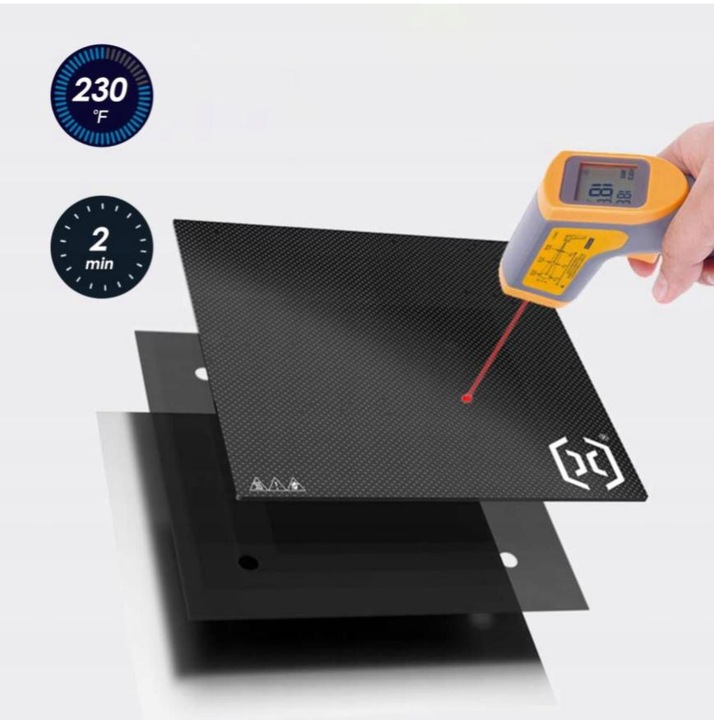 Платформа для печати из закаленного стекла обладает сильной адгезией и хорошо захватывает отпечатки, поэтому их можно удалить без особых усилий. Кроме того, горячая кровать быстрого нагрева переменного тока может быть нагрета до 110 ℃ за 2 минуты.