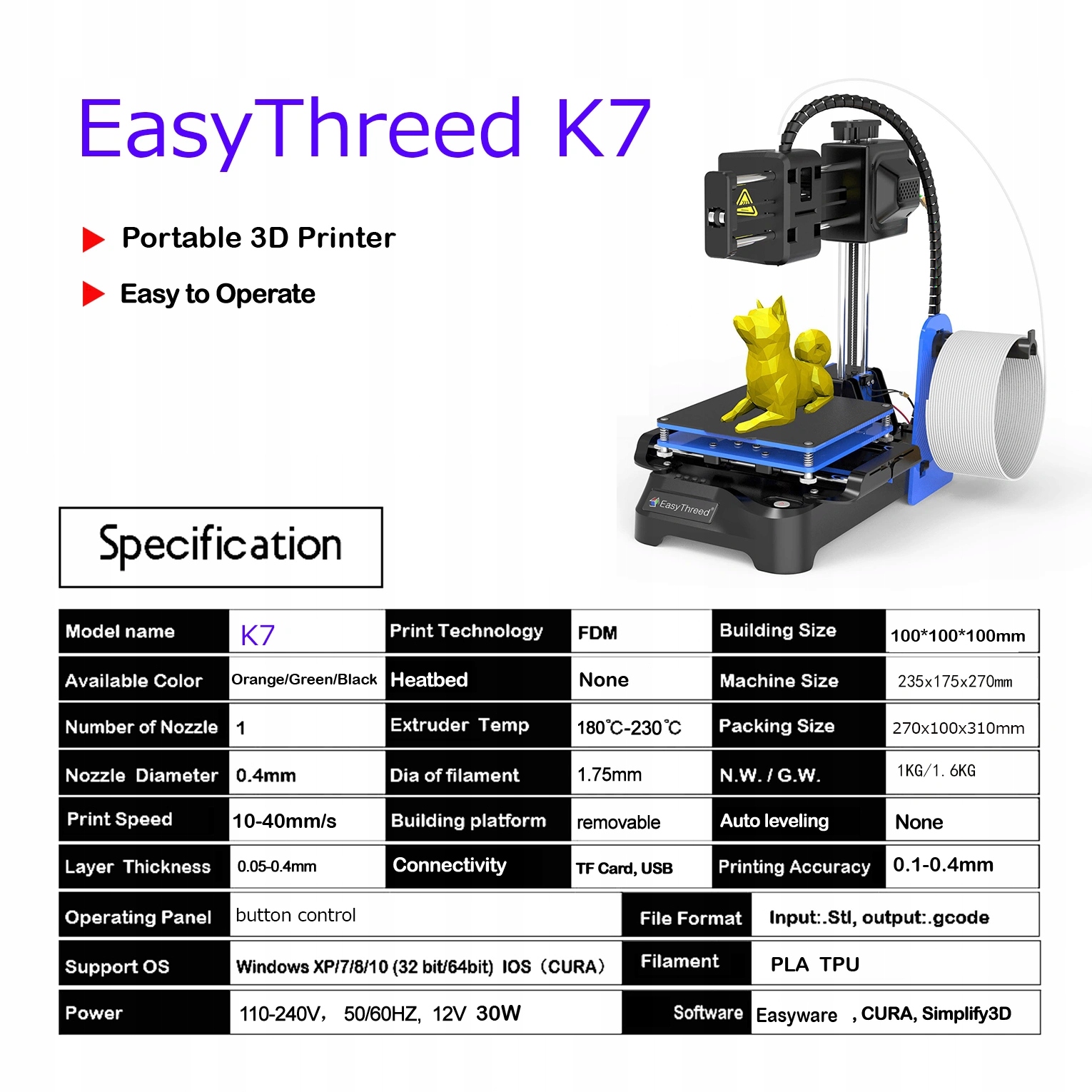 Характеристики продукта: Название модели: K7 Бренд: Easythreed Технология печати: FDM Размер корпуса: 100X100X100 мм Количество сопел: 1 Диаметр сопла: 0,4 мм Толщина слоя: 0,1–0,4 мм Нить для печати: PLA Диаметр нити: 1, 75 мм Точность печати : 0,1- Слайсер 0,2 мм Программное обеспечение: Easyware K7, CURA, Simplify3D Температура экструдера: 180–230 ℃ Скорость печати: 10–40 мм/с Формат Fila: Входные данные:. Stl/vol, вывод:. gcode Мощность: 12 В, 30 Вт Размер машины: 175 x 235 x 270 мм Размер подарочной коробки: 270 x 100 x 310 мм Картонная коробка: 545 x 375 x 335 мм (8 штук в коробке) Вес: 1,6 кг Н. вес: 1 кг Строительная платформа: Съемный Поддержка операционной системы: Windows XP/7/8/10 (32/64 бита) Возможность печати: TF-карта, USB-кабель, отраслевые сертификаты: CE, FCC, RoHS, REACH, WEEE, PSE p>