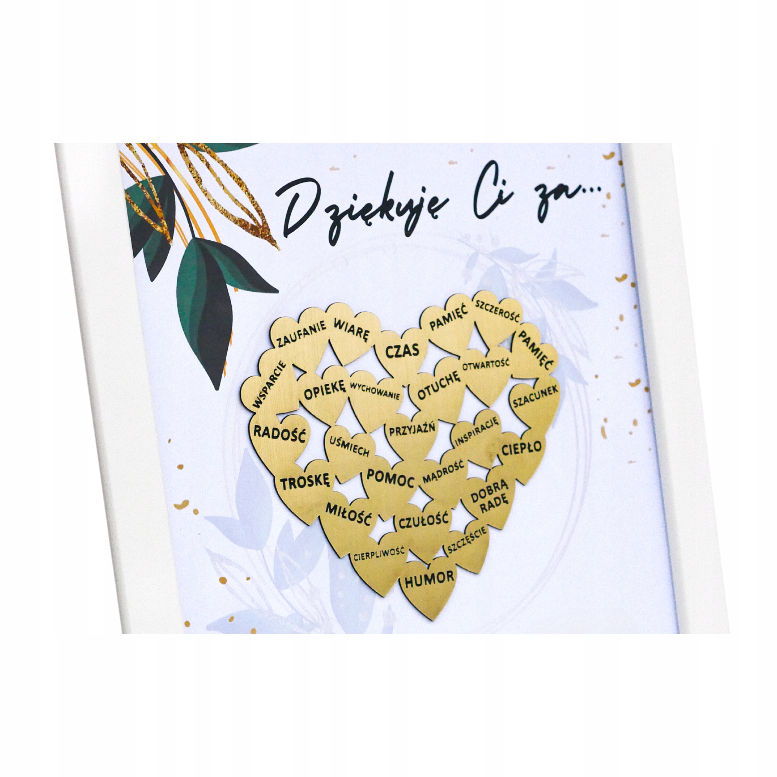 - В рамке находится золотое зеркальное 3D-сердце, состоящее из сердечек меньшего размера, на котором написаны благодарственные тексты