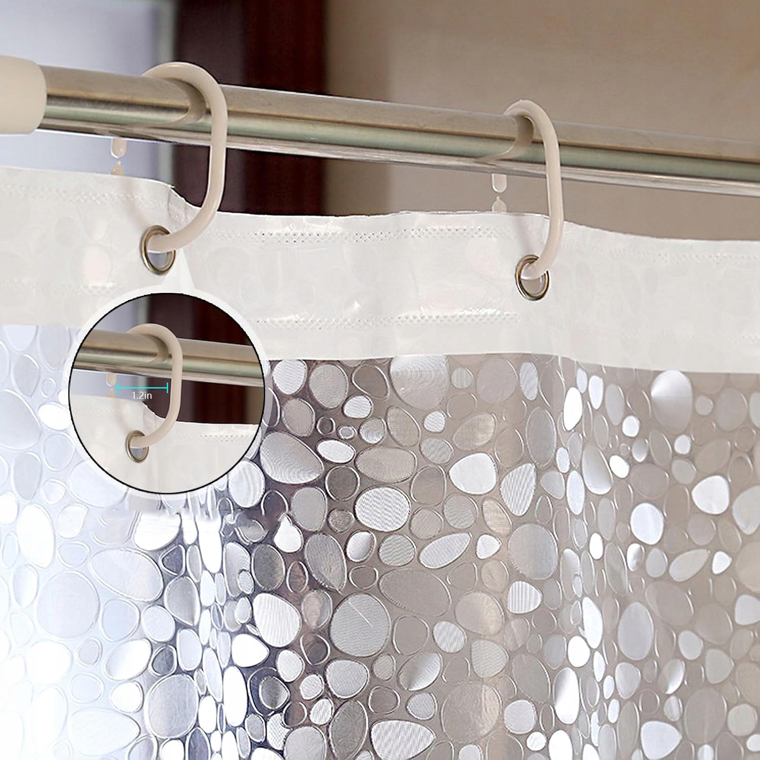 нержавеющие металлические глаза на Верх предотвращает разрыв и повреждение занавески душа. Анти -флеки и антибактериальные, эффективно предотвращение развития плесени и бактерий. Занавестный водонепроницаемый. ткань или губка