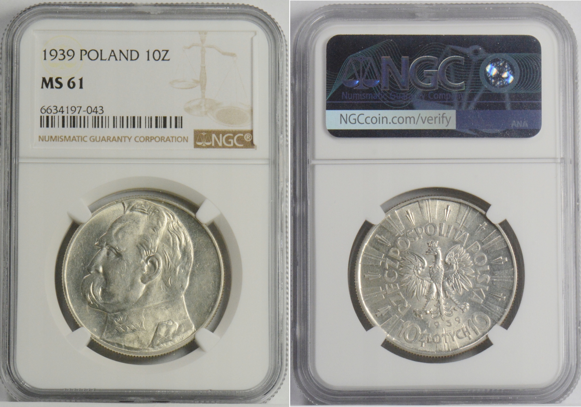 3DW. 10 ЗЛОТИЙ 1939 J.PIŁSUDSKI GRADING NGC MS61