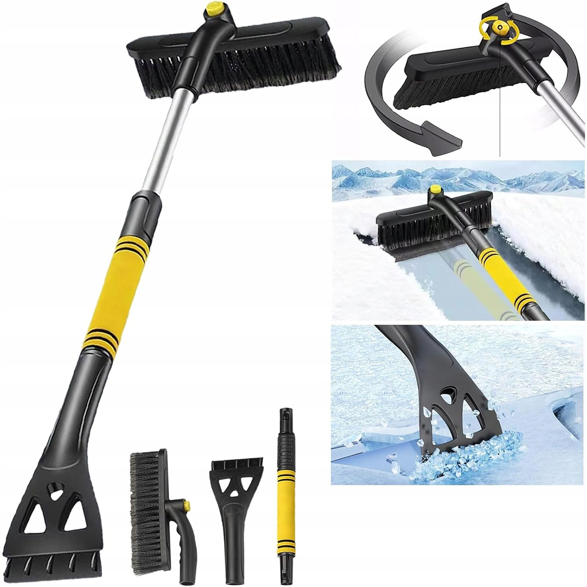 Стеклянный стеклянный скребок с метлой, 3 в 1 автомобильный стеклянный стеклянный скребок с метлой, съемный телескопический разморозитель, снежная щетка с вращающейся головкой 360 °, снежной кистью с не скользящей ручкой из пены (черная и желтая) h1>