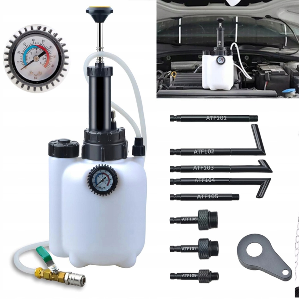 Инструмент для перекачки жидкости для системы заливки масла механической коробки передач. Для подачи и всасывания жидкости ATF из автомобилей. Оснащен пневматическим приводным механизмом. С индикатором уровня для легкой проверки уровня жидкости.