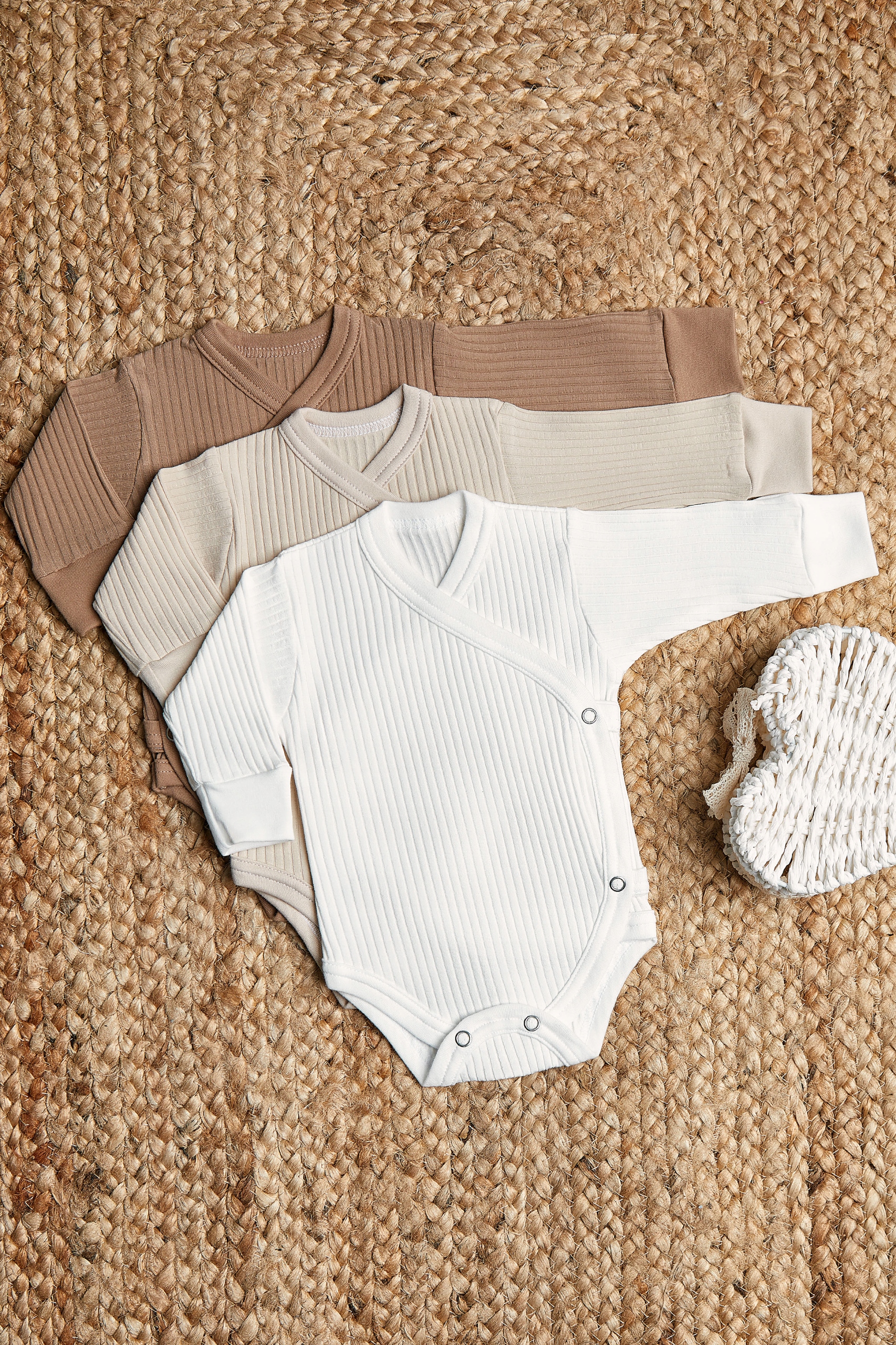 3x Детское боди с длинными рукавами кроя-конверта - т. н. конверты. Изготовлен из мягкого, удобного хлопка в рубчик. Боди застегивается на кнопки. Застежки, используемые в нашей одежде, не содержат никеля, что делает ее безопасной для нежной детской кожи и неаллергенной.
