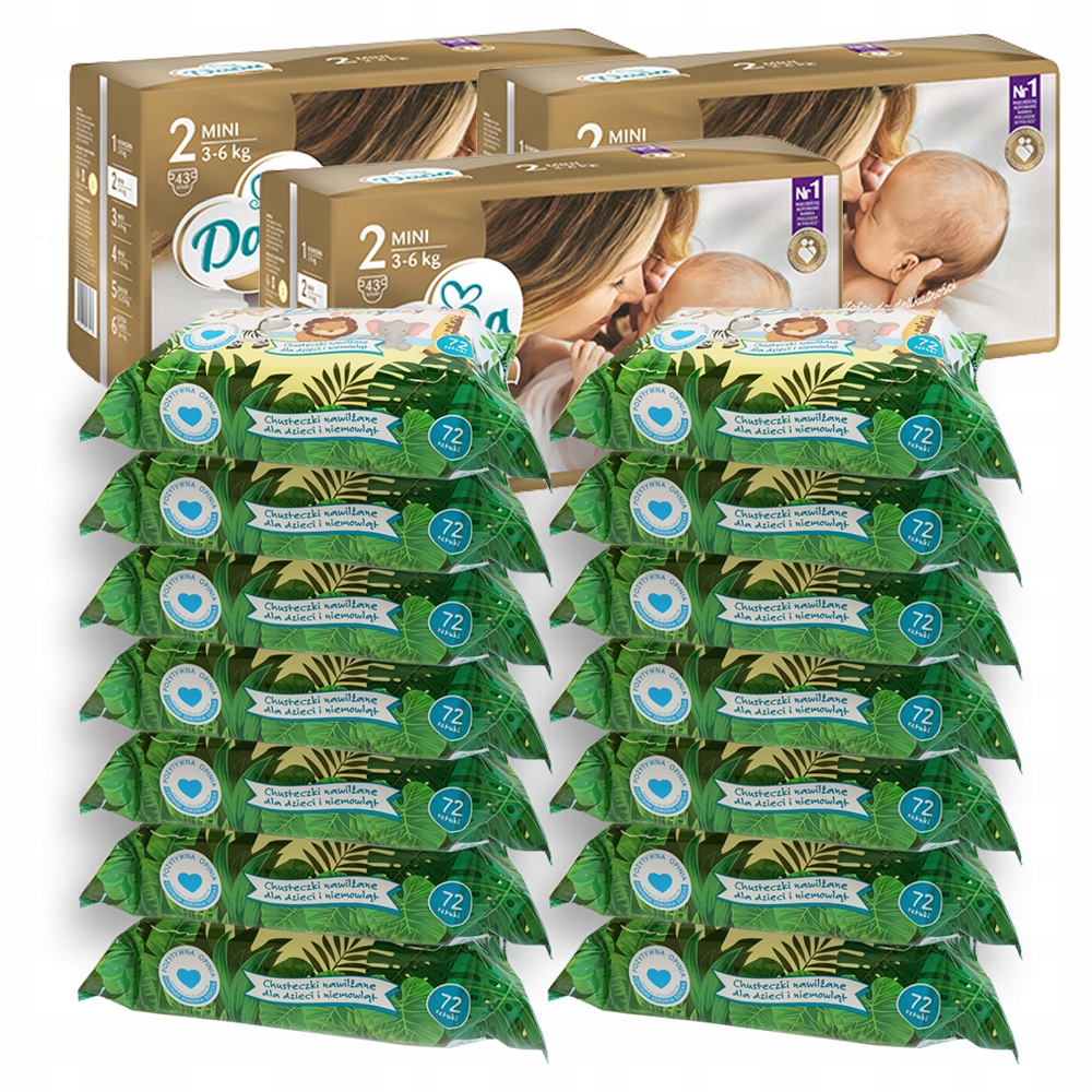 Набор включает в себя 3 пакета Pampers Dada Extra Care 2 Mini (43 шт в одном пакете) и 2 коробки с увлажненными салфетками