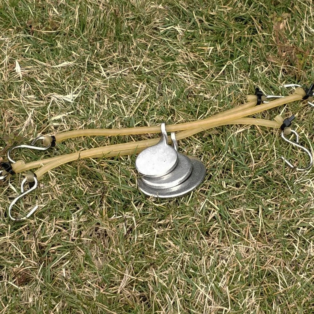 Резиновый шнур и два крючка позволяют включить его или прикрепить куда-нибудь, к дереву, горизонтальному столбу и т. д.