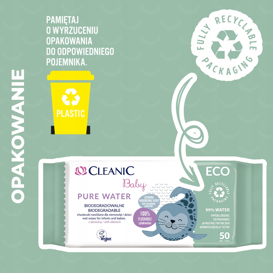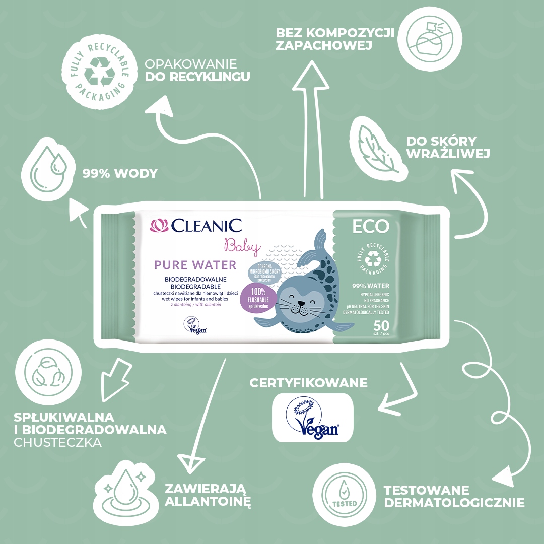 Смываемые салфетки Cleanic Baby ECO Pure Water представляют собой продукт на основе 99 % воды. Формула продукта дополнительно обогащена аллантоином, обладающим увлажняющими и успокаивающими свойствами. Салфетка полностью биоразлагаема, распадается в воде, поэтому после использования ее можно выбрасывать в унитаз. Упаковка продукта полностью пригодна для вторичной переработки. Сертифицированный, гипоаллергенный продукт, без ароматизаторов, pH-нейтральный для кожи, дерматологически протестирован.