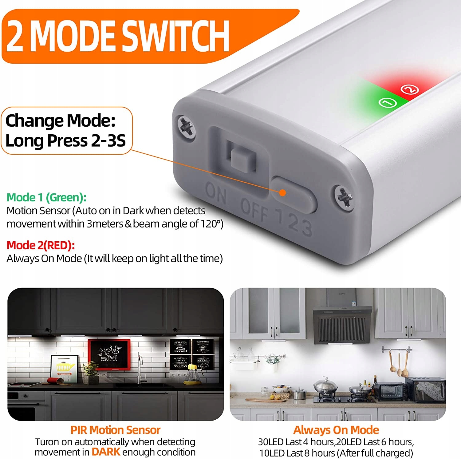 - Аккумулятор: питание от встроенного аккумулятора (600 мАч, 270 люмен). Батарейки ААА не требуются. Зарядка через зарядный кабель (USB-адаптер, павербанк, ноутбук). 30 светодиодов светятся в течение 4 часов / 20 светодиодов светятся в течение 6 часов / 10 светодиодов светятся непрерывно в течение 8 часов после полной зарядки. В режиме датчика движения PIR свет длится около 1 месяца.