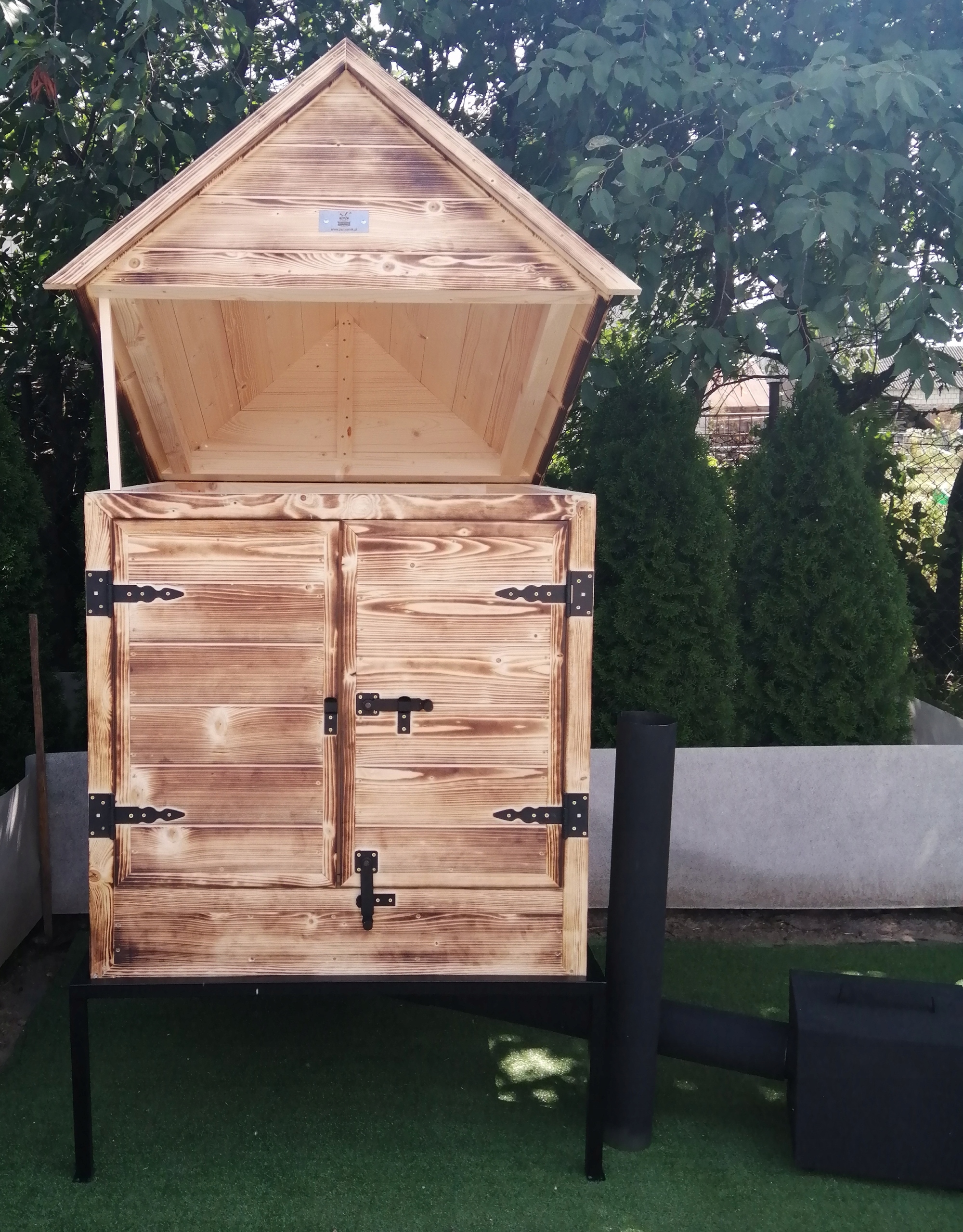 - Внешние размеры коптильни с крышей и ножками: 100 х 100 х 200 [см] li>