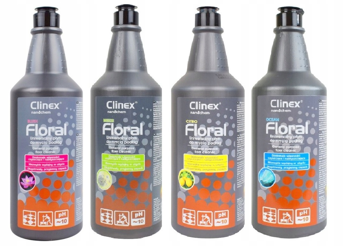 Бренд Clinex включает серию средств для чистки пола Clinex Floral. Продукт представлен в четырех очень интересных ароматных нотах: Fruit, Blush, Citro и Ocean.