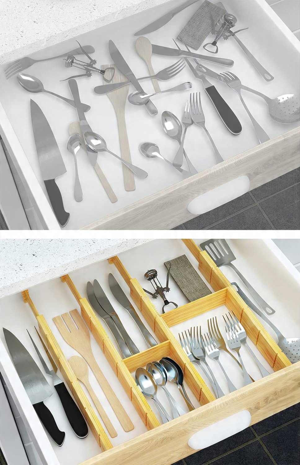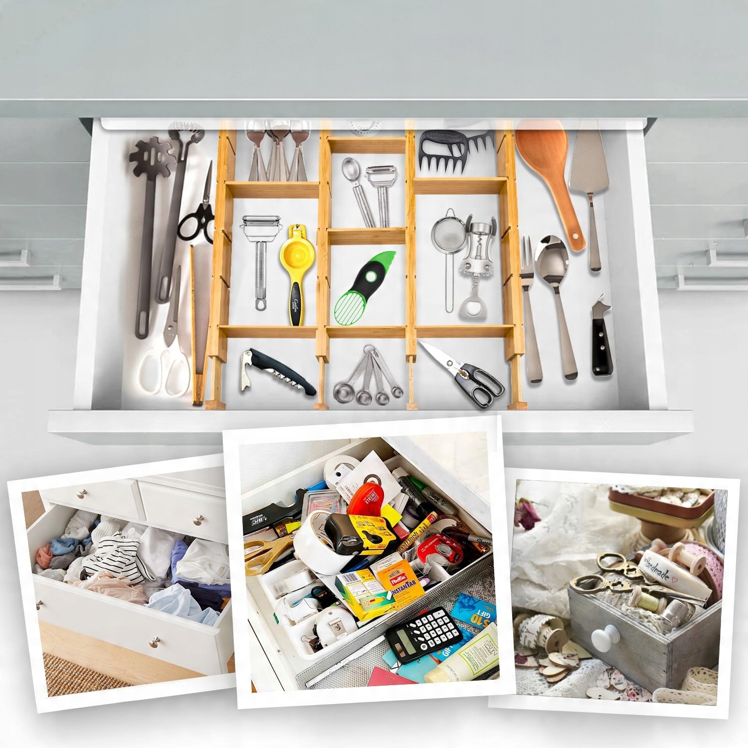 Разделители будут идеальными для кухни для организации столовых приборов и кухонной посуды, в спальне для сегрегации нижнего белья и носков, в ванной комнате для организации косметики и в офисе для хранения канцелярских товаров и документов
