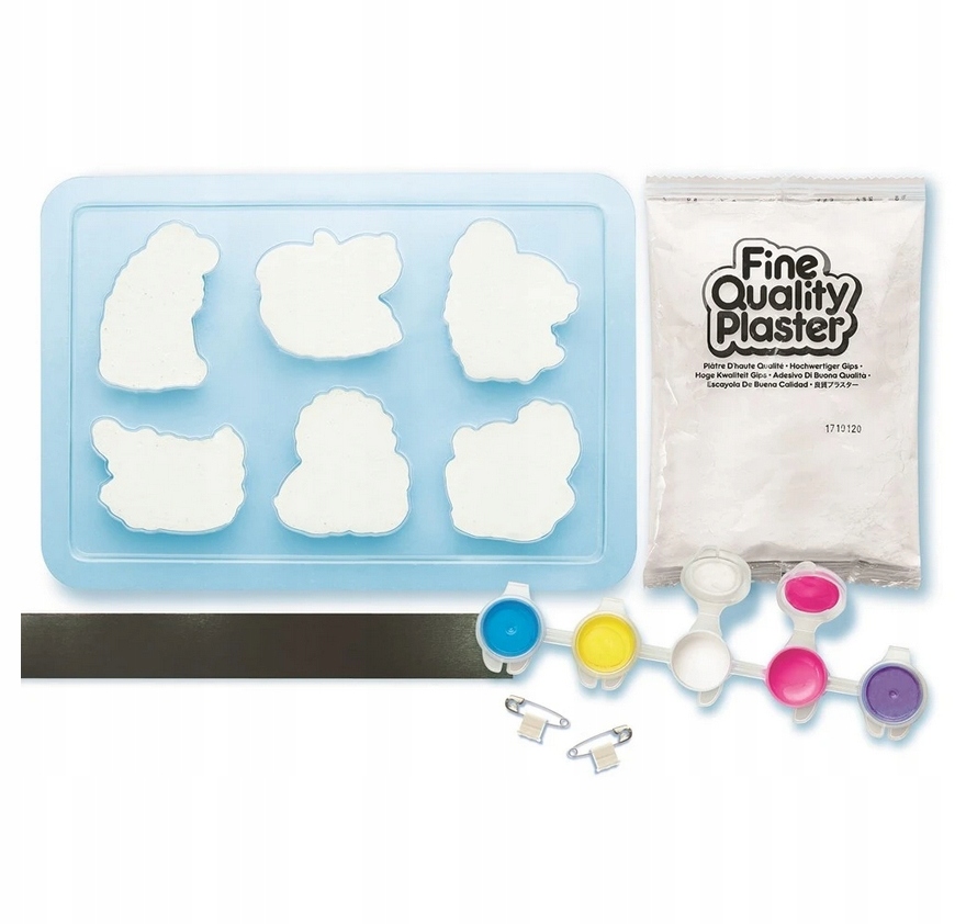 Набор содержит 1 форму с 6 конструкциями, 1 пакетом с штукатуркой, 1 ремнем с основой магнитов, 2 контактами, 5 красками, 1 кистью и подробными инструкциями. Контента достаточно, чтобы сделать 6 отливок. Возраст: 5+.