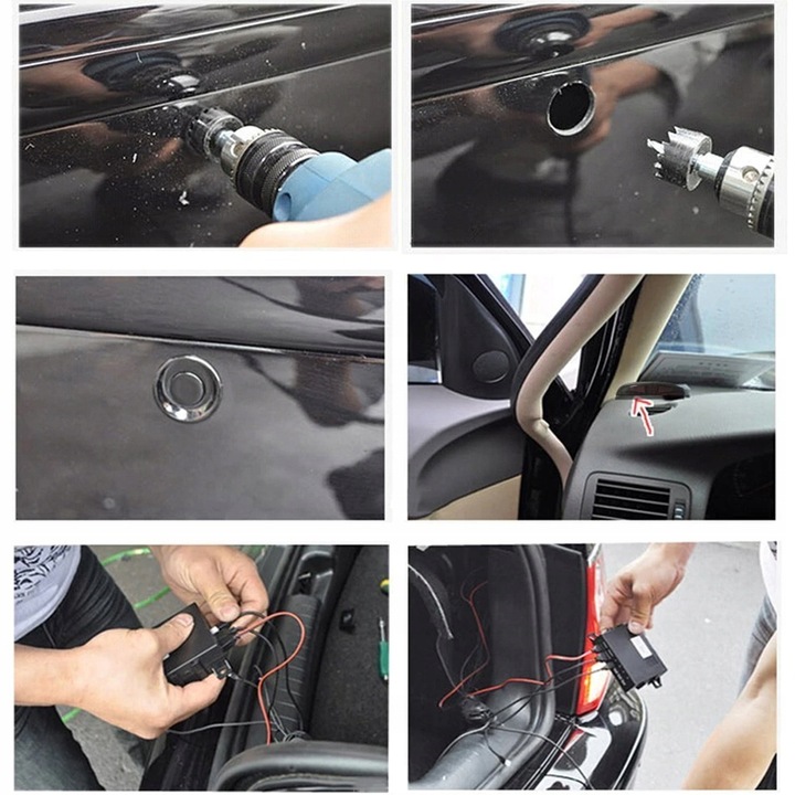 В комплект входят необходимые сборочные элементы, такие как дрель с кольцевой пилой 22 мм и проводка, такая как кабель питания и кабели датчиков, а также блок питания, четыре датчика и ЖК-дисплей. Благодаря интуитивно понятной сборке и креплению элементов вы сможете легко и быстро установить опорную систему самостоятельно при парковке. Просто дрелью проделайте отверстия для размещения датчиков, подключите блок питания к приемнику и ЖК-дисплею.