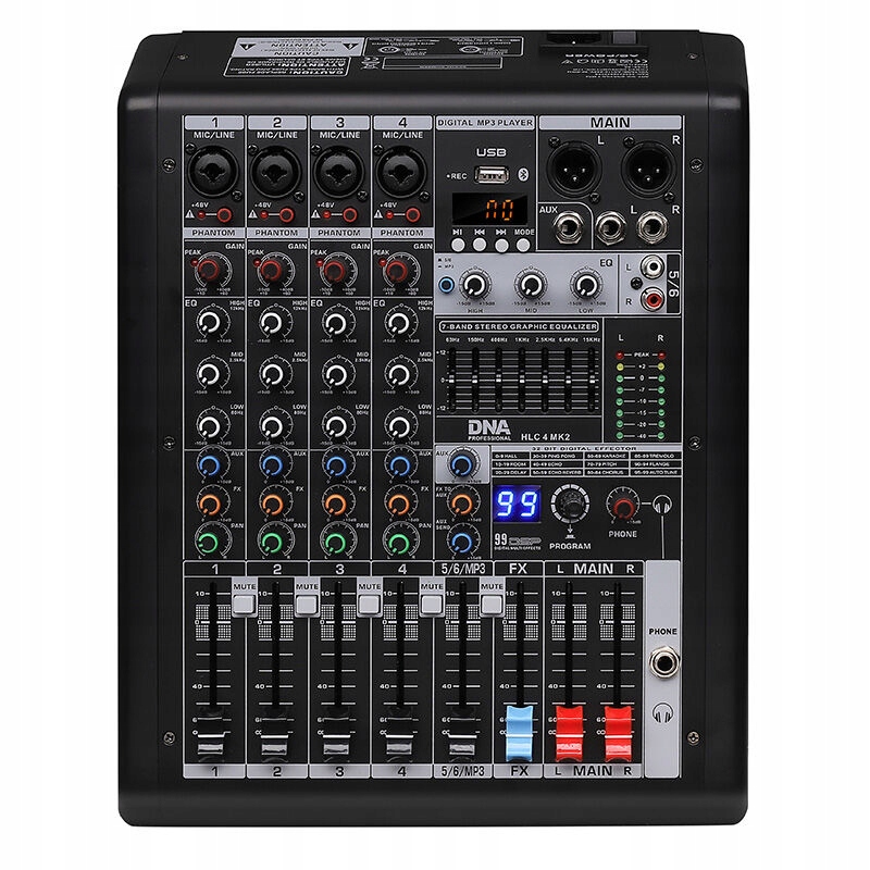 Каждая из четырех дорожек аудиоконсоли имеет балансный вход MIC/LINE, предназначенный для ввода сигнала с высоким сопротивлением, и переключатель фантомного питания +48 В. К каждому входу можно подключить микрофон, а также проигрыватель виниловых пластинок, DJ-консоль или, например, клавишный инструмент. На уровне отдельной дорожки мы можем управлять такими параметрами, как уровень усиления звукового сигнала, диапазон частот высоких, средних и низких тонов, контроль уровень эффектов, b>изолировать или отключить звук одной дорожки, установить уровень сигнала AUX и панорамировать звук между левым и правым основные каналы шины. Благодаря удобным ползункам-фейдерам мы можем легко установить интересующий нас уровень громкости, а любые случаи клиппирования будут быстро сигнализироваться красным светодиодом. Основной раздел звукового микшера позволяет подключить к консоли внешний рекордер или плеер, подать обратный сигнал от внешних устройств, а также управлять встроенным цифровым процессором из 99 мультиэффектов. б> . 7-полосный графический эквалайзер позволяет управлять тембром интересующего вас микса, который можно точно отслеживать с помощью наушников. Дополнительным преимуществом DNA HLC 4 MK2 является также функция контроля уровня FX TO AUX