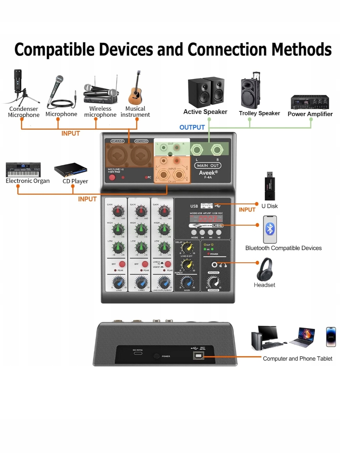 4 -канальный входной миксер - мини -миксер идеально подходит для подключения со многими устройствами. 2 xlr Line входные розетки для соединения микрофонов или гитары, 1 пара L/R 6,35 мм и 1 пара стерео входов L/R-CUT для подключения CD/клавиш/компьютеров. Плюс 1 пара выходов L/R Cinch и 1 основная пара выходов L/R 6,35 мм для подключения динамиков/усилителей мощности и т. Д. Совет: чтобы подключить телефон, вам нужен адаптер USB OTG для телефона. Только адаптер OTG может взять на себя передачу данных.