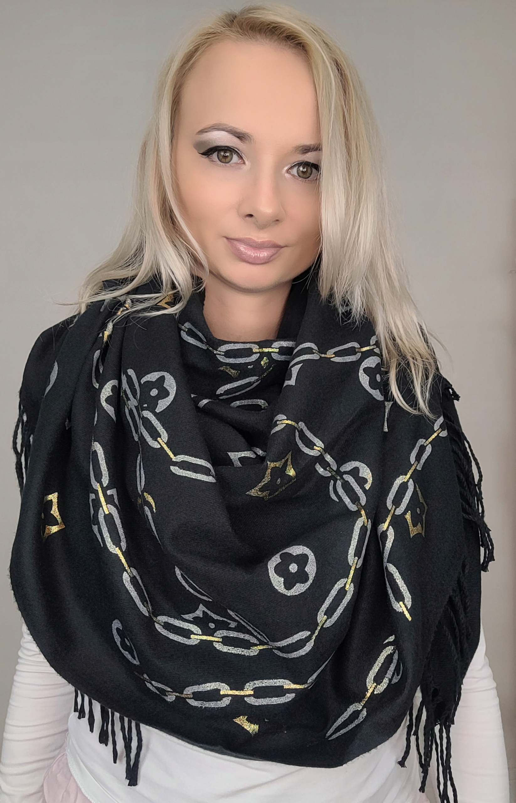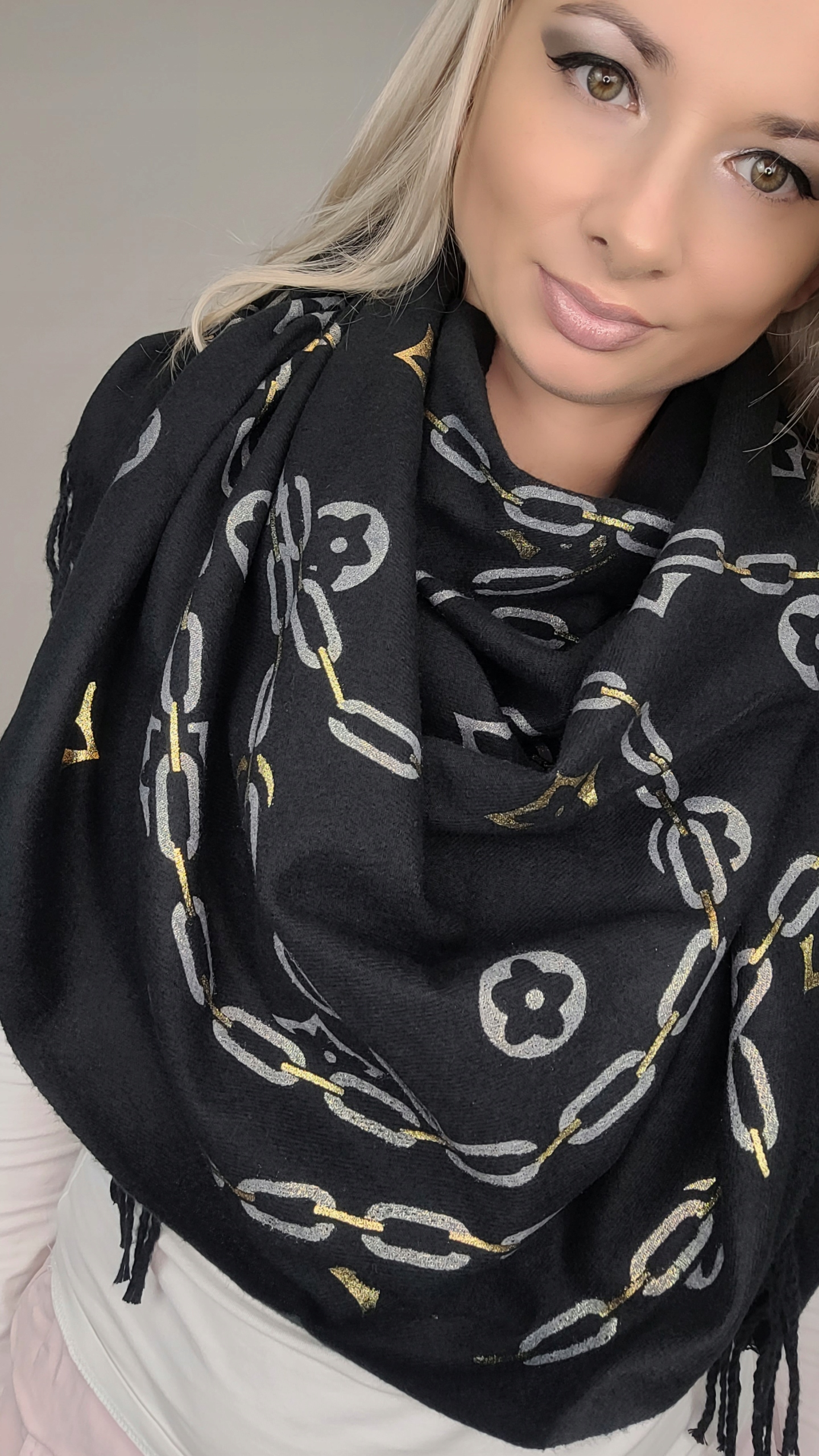 Последняя коллекция вискозных шарфов черного, серого и золотого цвета. Теплый, очень приятный на ощупь и привлекательный. Короткие стороны отделаны бахромой.