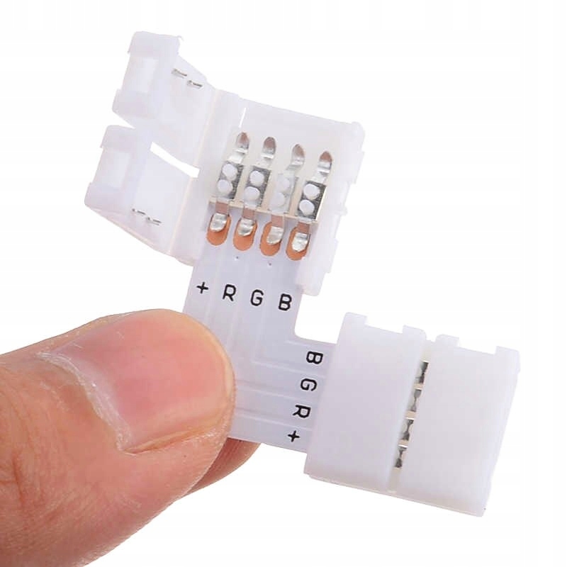 4-контактный угловой разъем SMD 5050 RGB представляет собой Угловой разъем для подключения разноцветных (RGB) светодиодных лент. Совместим с 4-контактными светодиодными лентами с RGB-диодами SMD 5050 (шириной 10 мм):