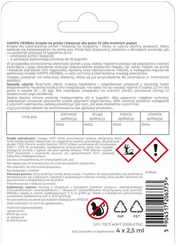 ✔ Одна доза капель защищает животное до 4 недель. Чтобы обеспечить непрерывность защиты, снова используйте подготовку до конца этого периода.