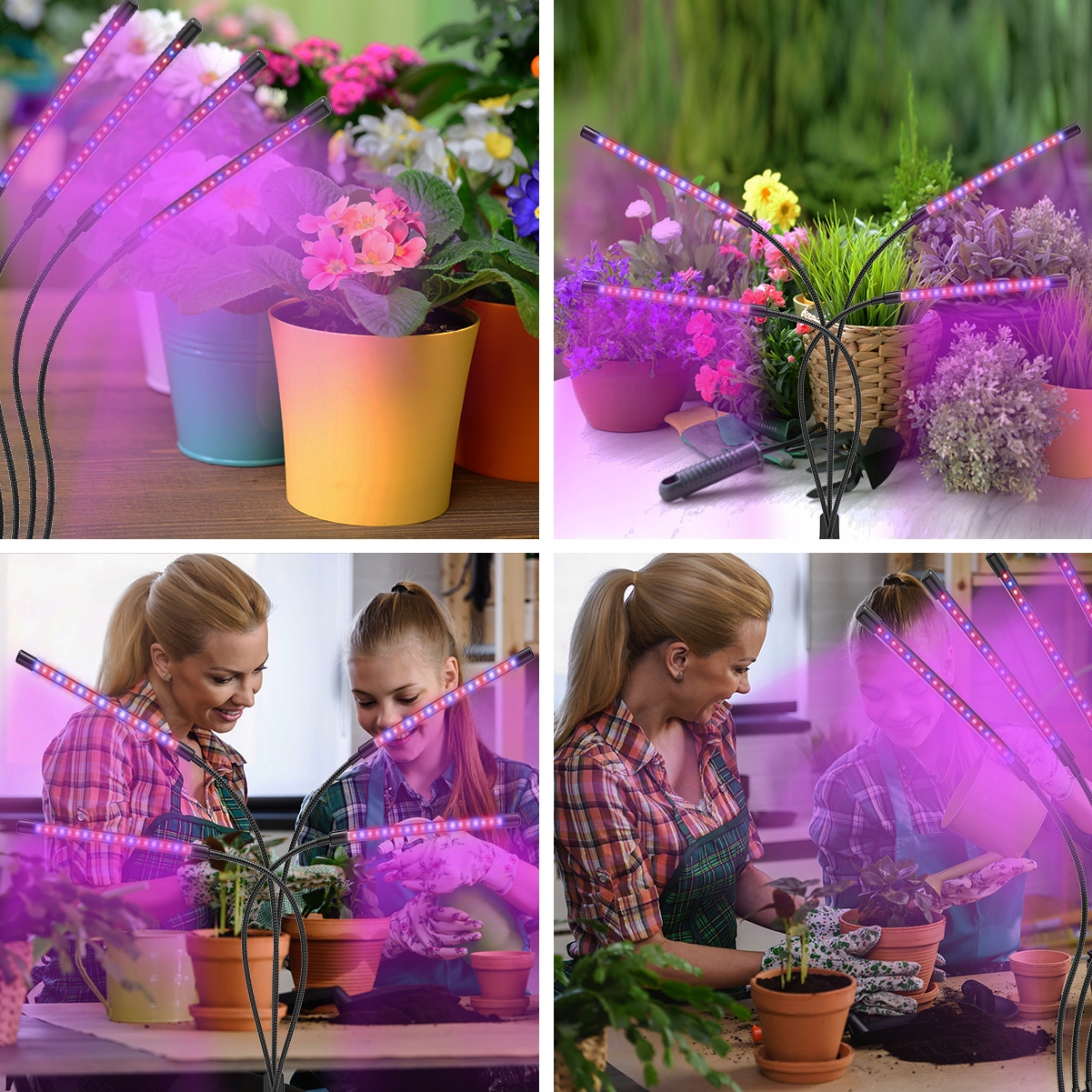 Лампа с четырьмя светодиодными головками, поддерживающая правильное развитие растений и процесс фотосинтеза.