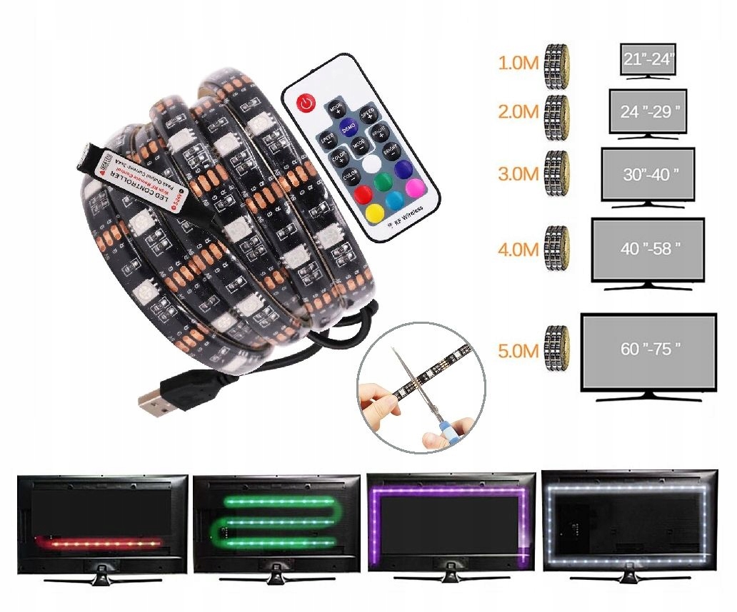 Подсветку нашего телевизора можно организовать очень просто. Ленту можно свободно разрезать через каждый 1 диод (3,33 см) и свободно сгибать. Он имеет широкий спектр применения и подходит для продуктов с интерфейсом USB 5 В, таких как компьютер, ноутбук, телевизор, блок питания, адаптер и т. д.