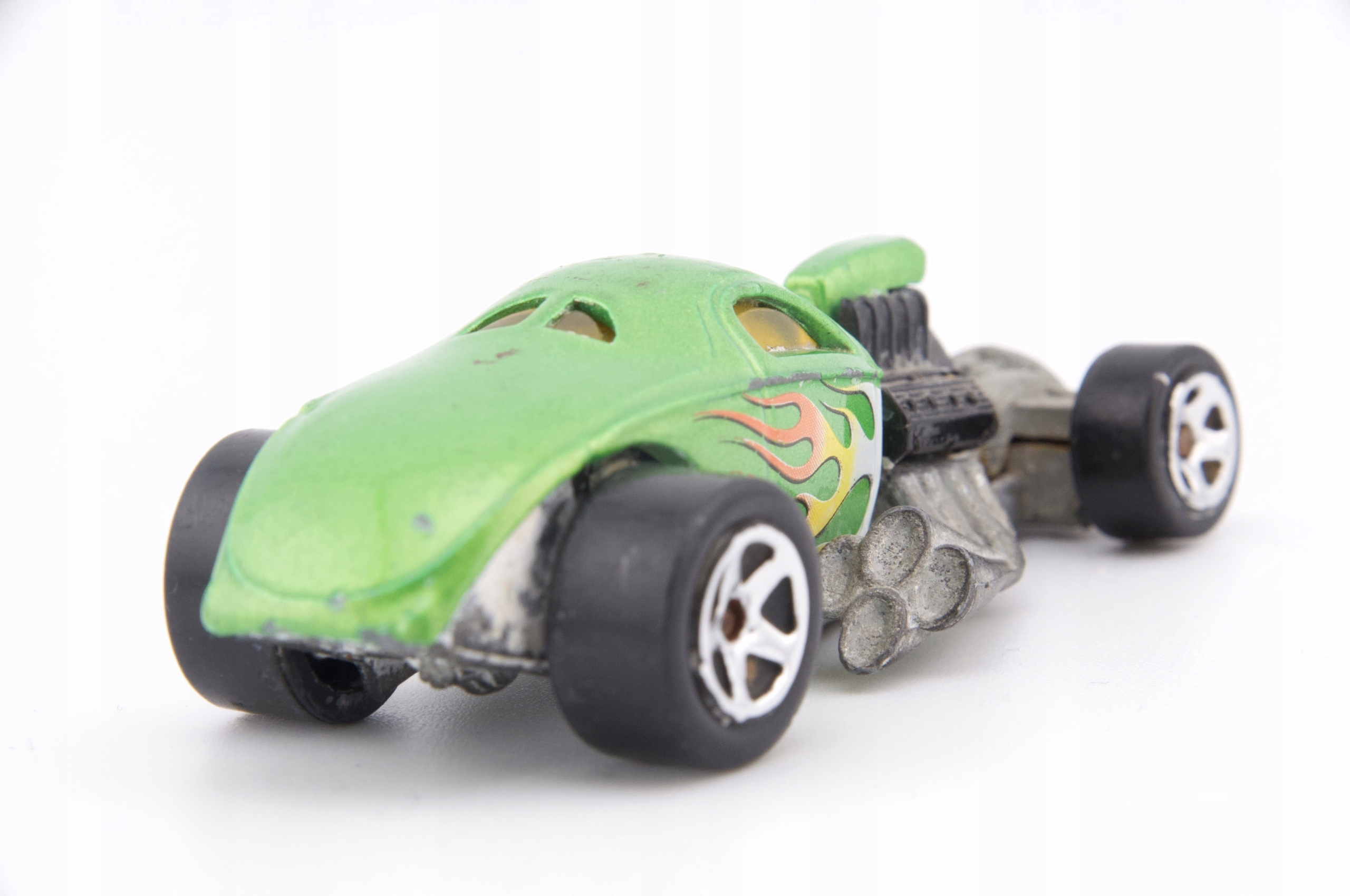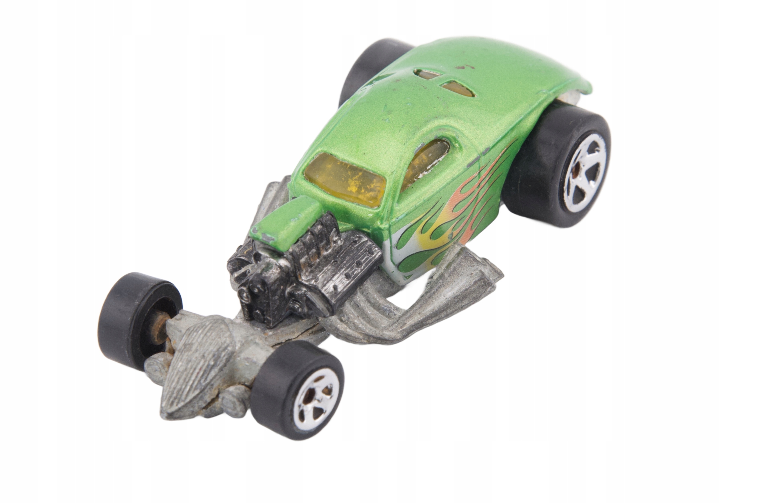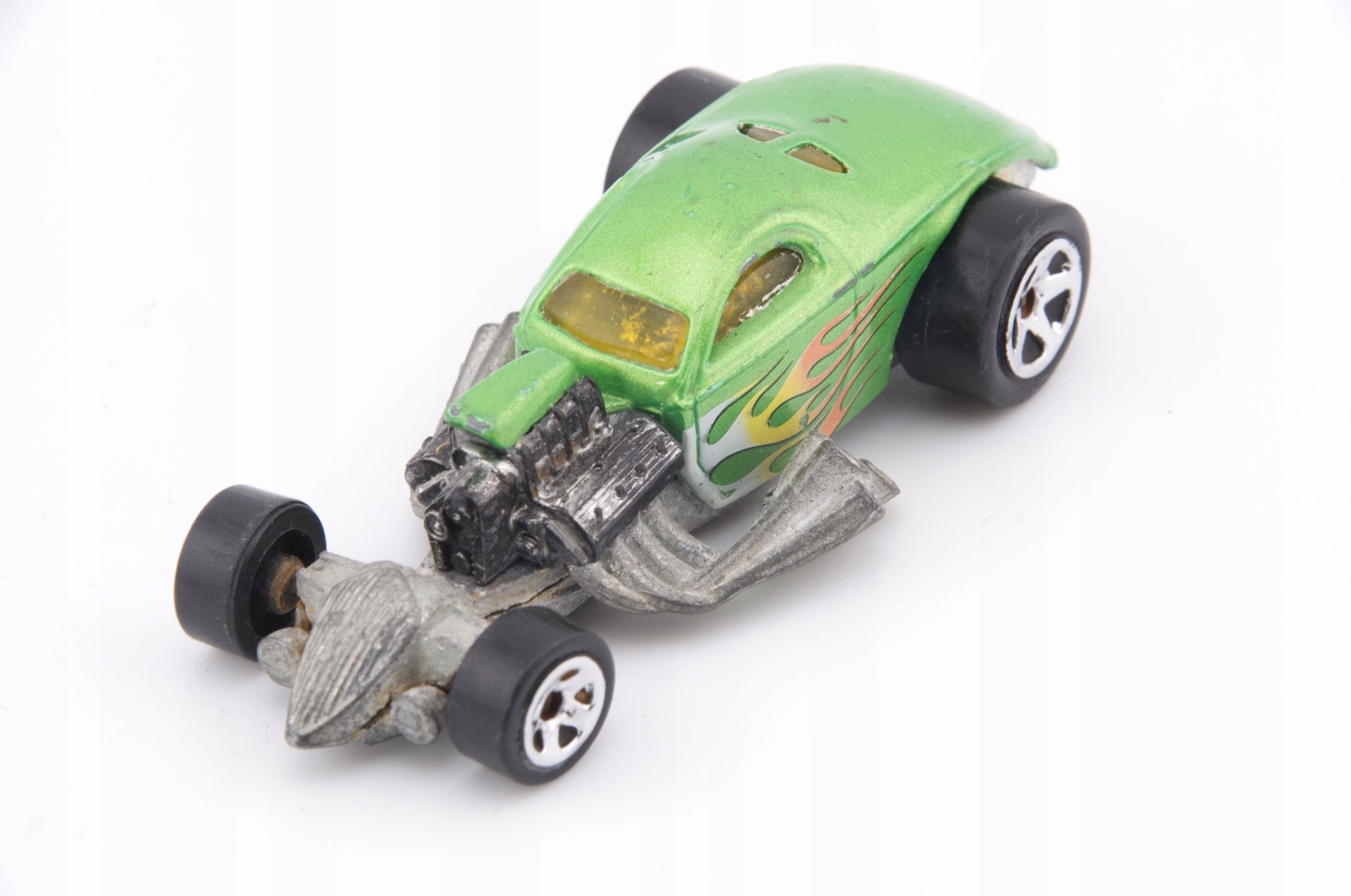 Эти пружины представляют собой уникальную модель 4 -мильного купе, которая привлекает внимание его зеленым цветом и динамическим пламенем по бокам. Изготовленный из металла, он имеет большой видимый двигатель и эффективные выхлопные трубы, которые придают ему характер. Модель находится в хорошем состоянии, хотя она показывает некоторые признаки использования. Это отличная позиция для коллекционеров, которые ищут уникальные модели с 2000 года. Она идеально подходит для тематических коллекций, связанных с расы и настройкой.