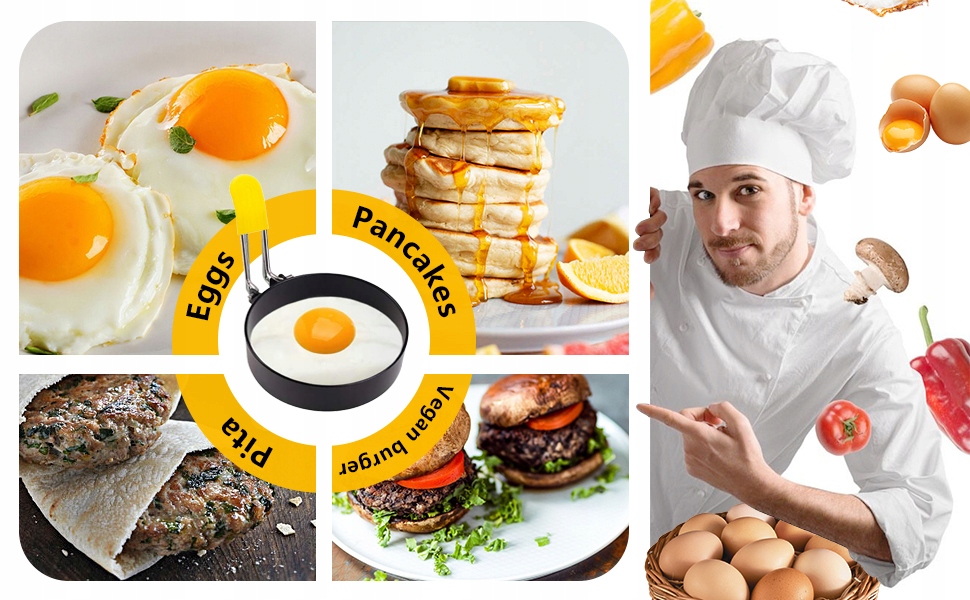 ➤ Premium Matal: яичное кольцо изготовлено из прочной нержавеющей стали, которая используется для округления яиц в круглой форме, чтобы создать идеальный английский кекс. Чистая и уникальная нержавеющая сталь, сопротивление высокой температуре, отсутствие деформации, отсутствие обесцвечивания, отсутствие ржавчины, долговечность и простая в приготовлении, легко хранить. В 2 упаковке с дополнительными защитными силиконовыми крышками в верхней части ручки, чтобы предотвратить ожоги пальцев. Сама ручка изготовлена из нержавеющей стали. Мы уверяем вас, что вы будете использовать наши неживые яйца для яиц. (Масляная щетка в наборе) Блины из яиц можно очистить вручную с небольшим количеством мытья посуды и водной жидкости. Поместите его в посудомоечную машину так, чтобы процесс был быстрым и простым. Яичное кольцо будет как новое, без каких -либо повреждений. Различные десерты. Сделано из еды для еды, безопасно для использования, идеально подходит как обручальное кольцо. Не беспокойтесь об одном завтраке, возьмите его домой и запустите свое воображение