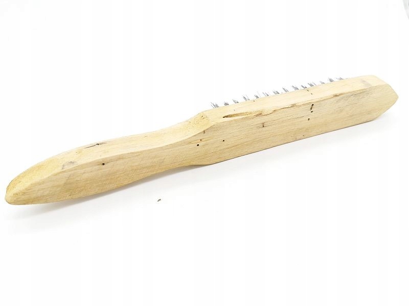 Щётинки щетки изготовлены из стальной проволоки и встроены в деревянную ручку. Изделие отличается надежным качеством изготовления, что гарантирует долгосрочное и надежное использование.
