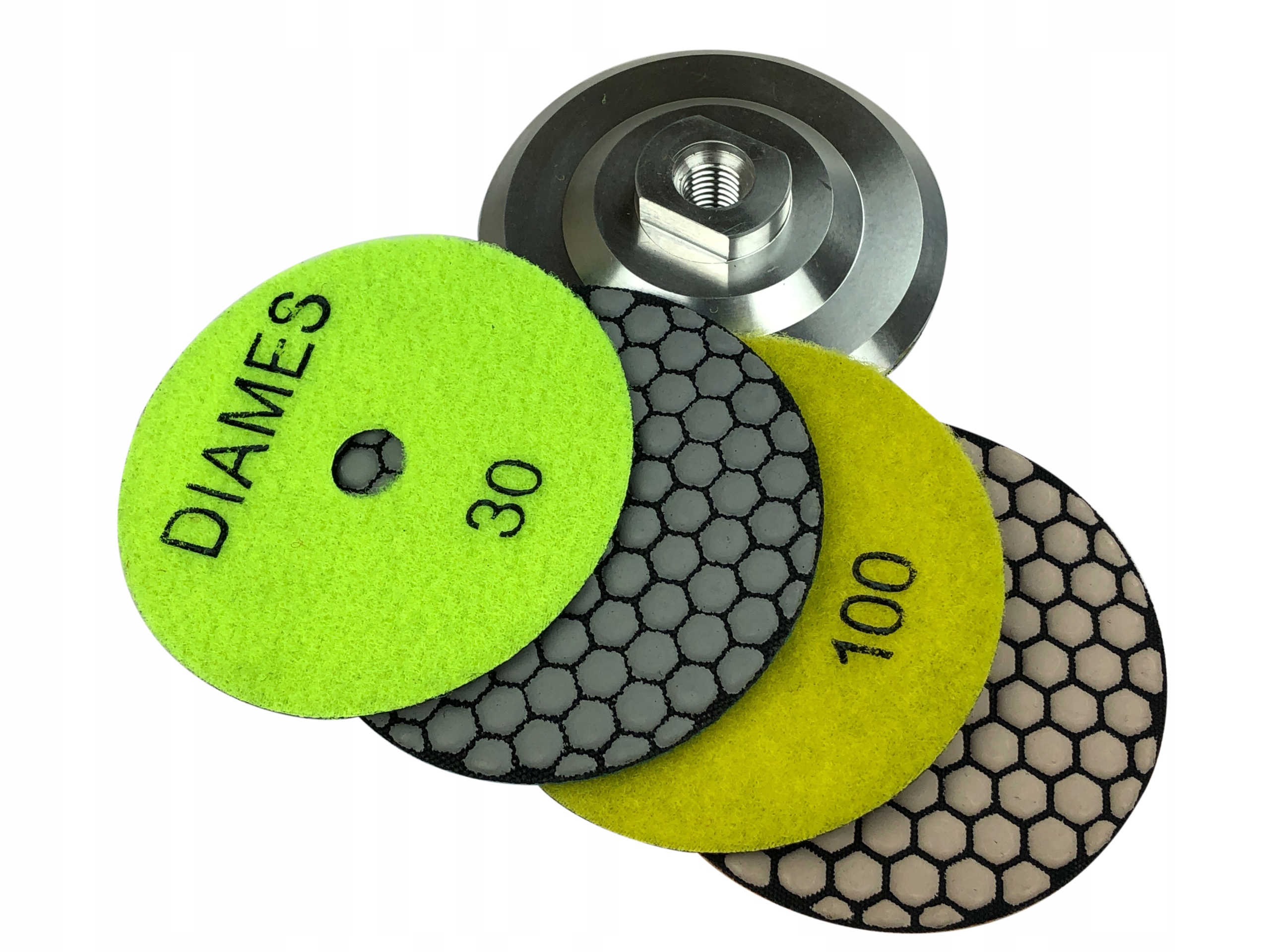 НАБОР ИЗ 4-Х СУХИХ АЛМАЗНЫХ ПОЛИРОВАЛЬНЫХ ДИСКОВ FI 100 ОТ №30 №50 №100 №200 + АЛЮМИНИЕВАЯ РУЧКА 100 ММ С РЕЗЬБОЙ М14 ДЛЯ ПОЛИРОВКИ КАМНЯ, ГРАНИТА, БЕТОНА, СДЕЛКИ ФАСОК ГЕРМАНИ И КЕРАМИКИ