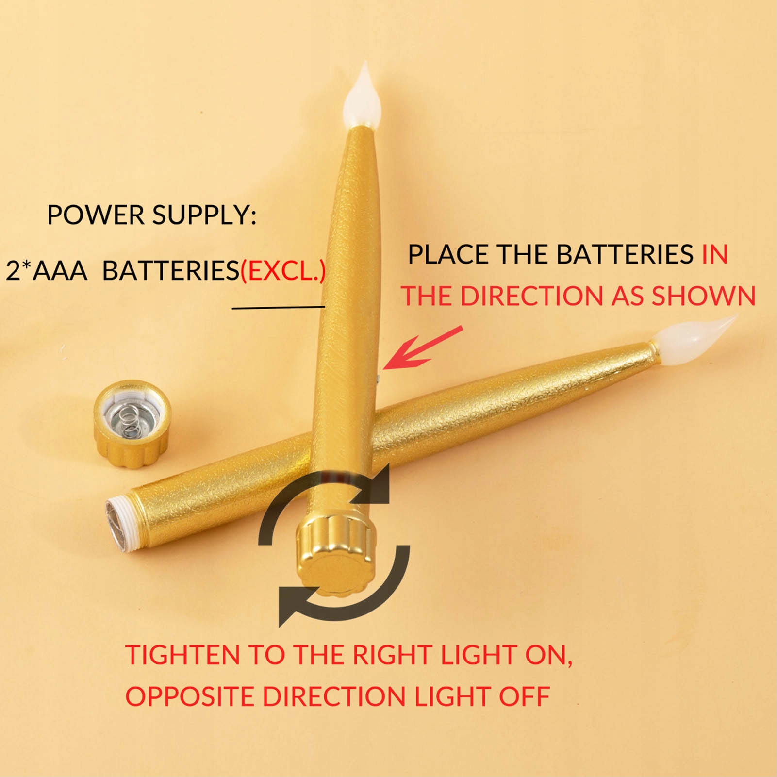 2. ПИТАНИЕ ОТ БАТАРЕИ: Для каждой свечи требуются 2 батарейки типа ААА (не входят в комплект), батарейки можно неоднократно заменять при использовании и длительном непрерывном освещении.