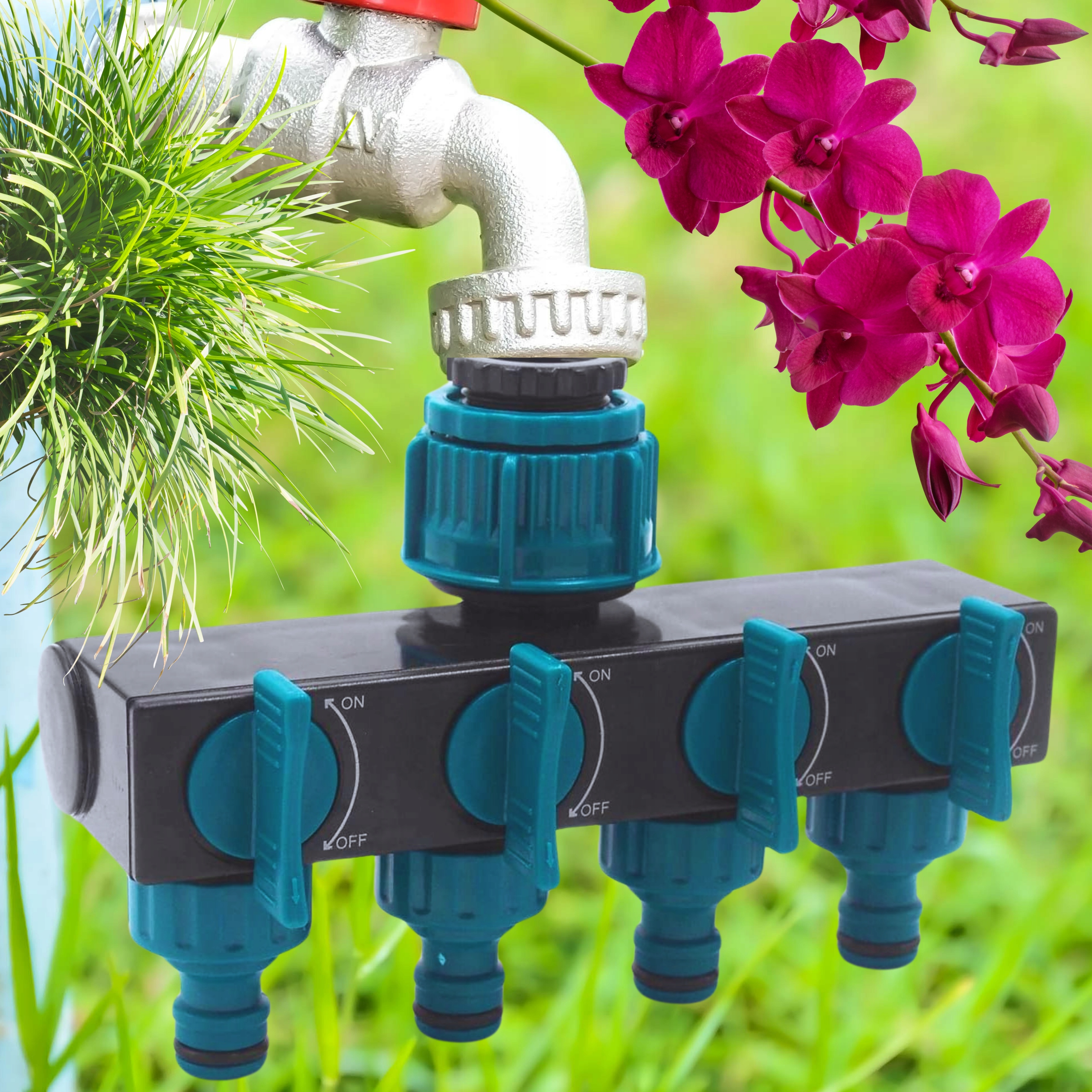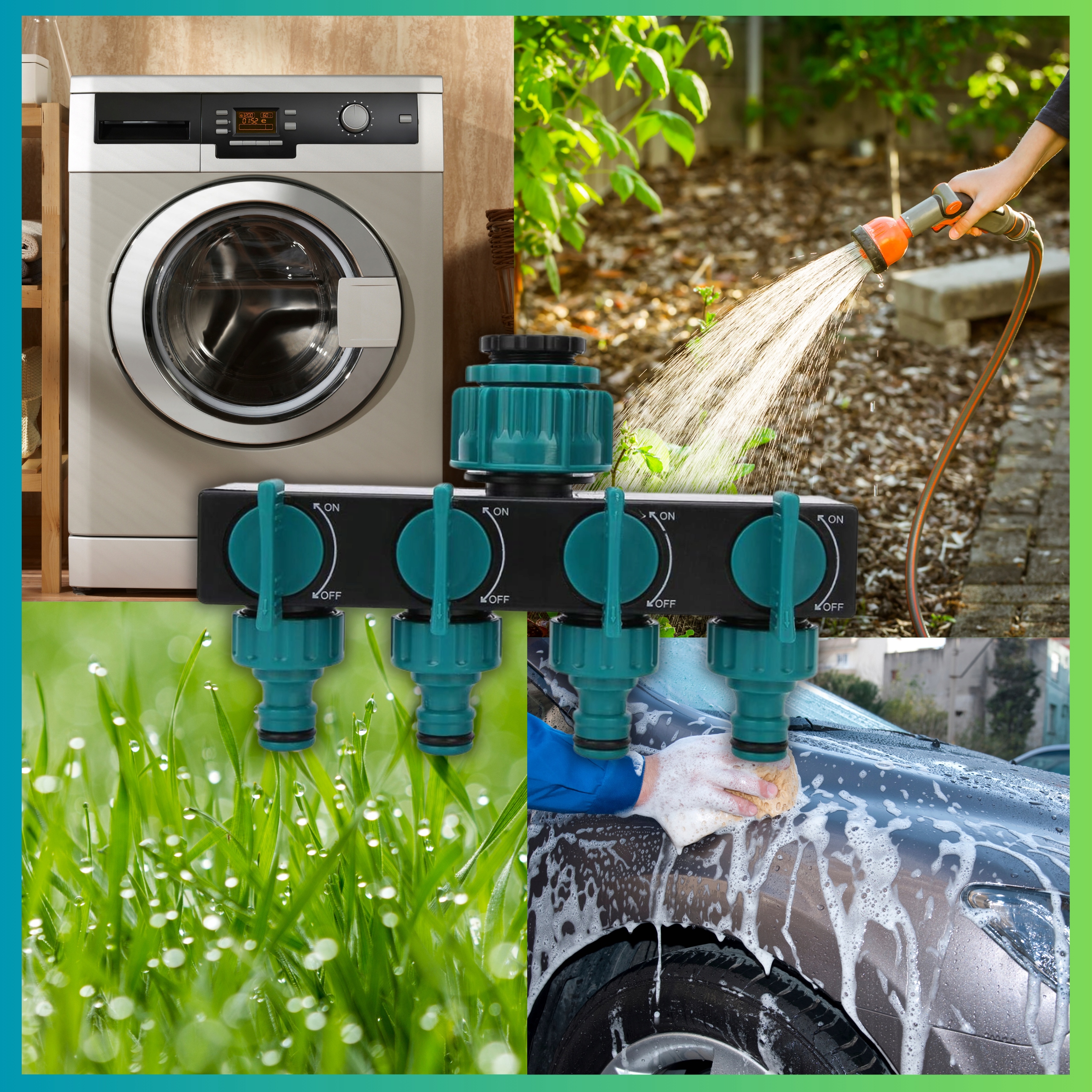 Позволяет подключить четыре садовых шланга, разбрызгивателя или других аксессуаров к одному крану, что позволяет одновременно поливать разные участки сада без необходимости перемещать устройства.
