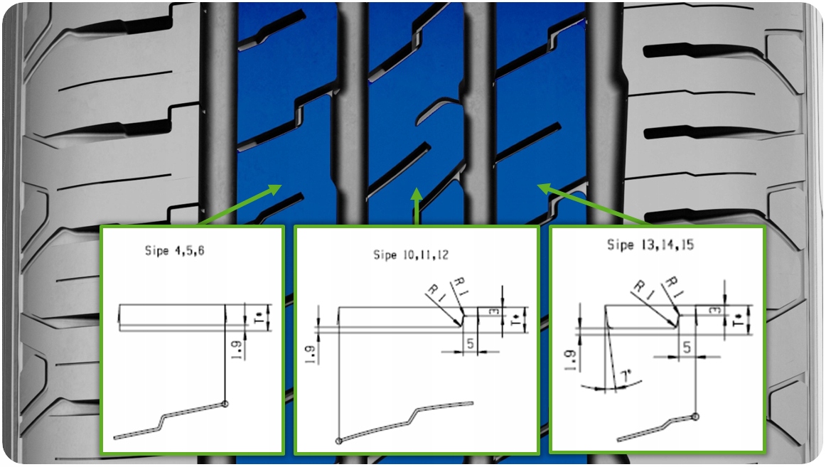 - Различные углы среза по всему рисунку протектора обеспечивают оптимальное сцепление при торможении и прохождении поворотов.