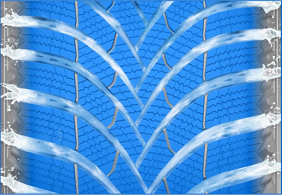 Рисунок протектора помогает рассеивать воду с дороги во время торможения и прохождения поворотов. V-образный рисунок эффективно отводит воду и слякоть, обеспечивая сбалансированную устойчивость при езде по мокрой дороге.