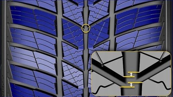 Оптимально расположенные блоки с поперечными вырезами в средних ребрах и плечах значительно улучшают сцепление со снегом. Особое расположение многофункциональных ламелей обеспечивает лучшее сцепление во всех направлениях при контакте с дорожным покрытием. Специальная конструкция профиля посередине улучшает боковое сцепление со снегом. Это обеспечивает исключительно хорошее сцепление с дорогой, короткий тормозной путь и безопасное движение по заснеженным дорогам.