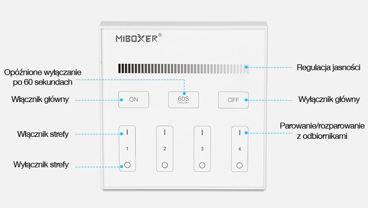 Пульт дистанционного управления работает в 4-зонном стандарте, а отдельные контроллеры также можно группировать вместе. Технология устройства позволяет использоватьодин пульт для многих ресиверов и управлять каждым каналом отдельно. Пульт дистанционного управления позволяет нам управлять миром от 1 до 4 зон - НЕЗАВИСИМО, и мы можем запрограммировать множество цепей освещения для каждой зоны.