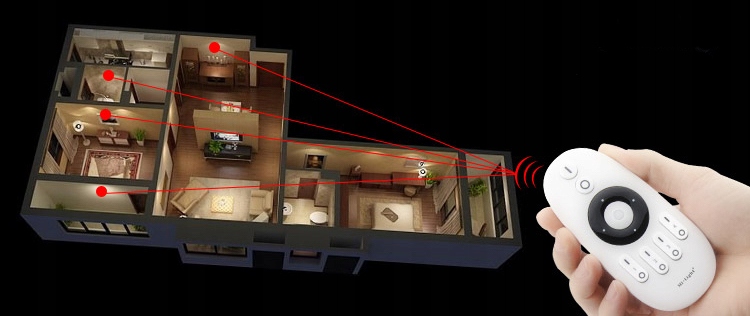 Пульт дистанционного управления работает в 4-зонном стандарте, а отдельные контроллеры также можно группировать вместе. Технология устройства позволяет использоватьодин пульт для многих ресиверов и управлять каждым каналом отдельно. Пульт дистанционного управления позволяет нам управлять светом от 1 до 4 зон - НЕЗАВИСИМО, и мы можем запрограммировать множество цепей освещения для каждой зоны.