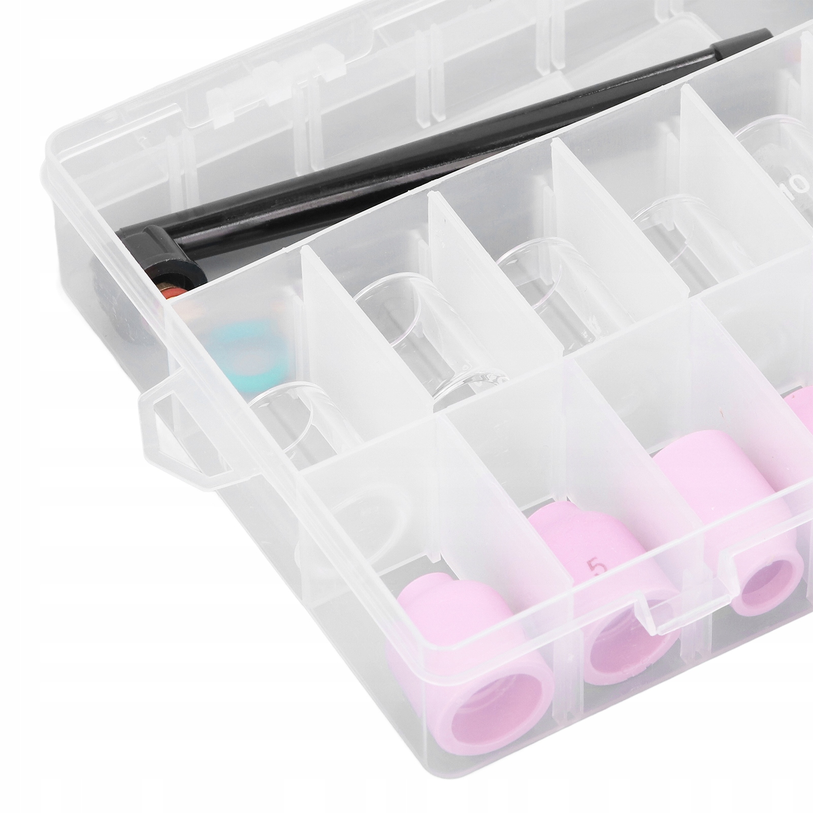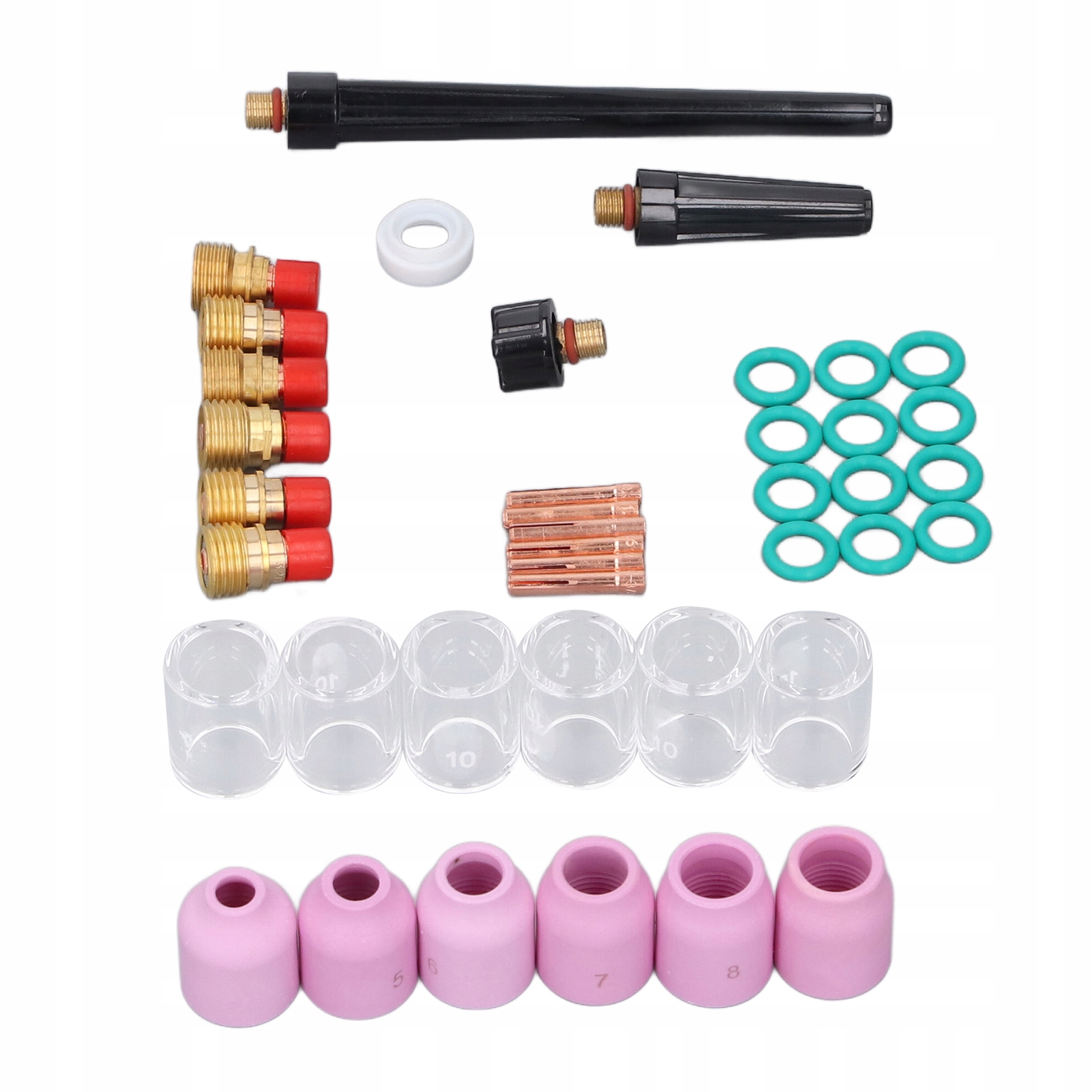 2. Входящие в комплект аксессуары: керамическое сопло, стеклянные чашки, задние крышки, небольшой корпус газовой линзы, короткие зажимы для электродов, кольца и передняя крышка из ПТФЭ, которые помогут вам выполнить различные сварочные задачи