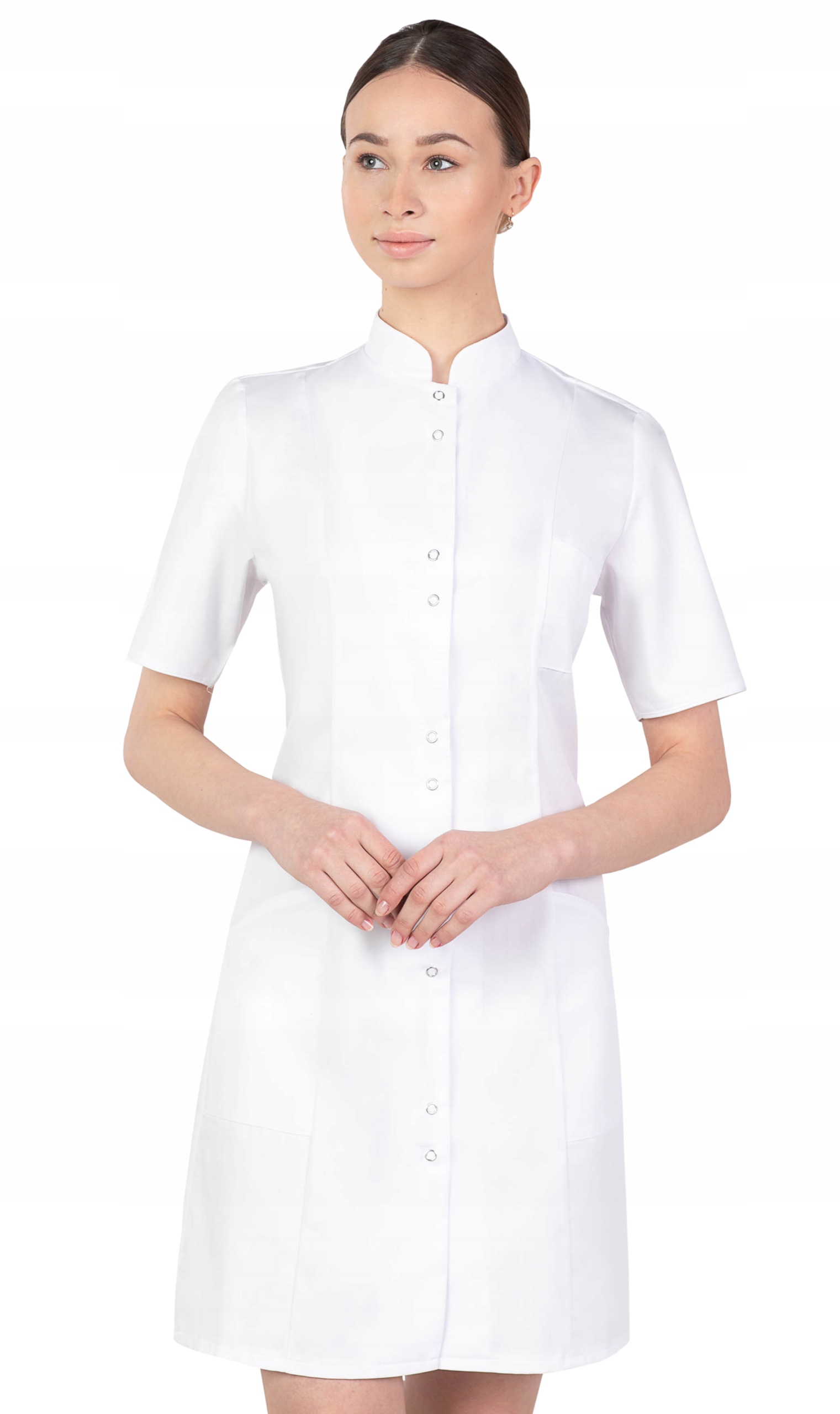 Женский медицинский халат с короткими рукавами. Индивидуальный крой, идеально подчеркивающий фигуру. Длина фартука 95 см, застегивается на двойные кнопки. Фартук имеет два больших боковых кармана и один маленький на левой груди.