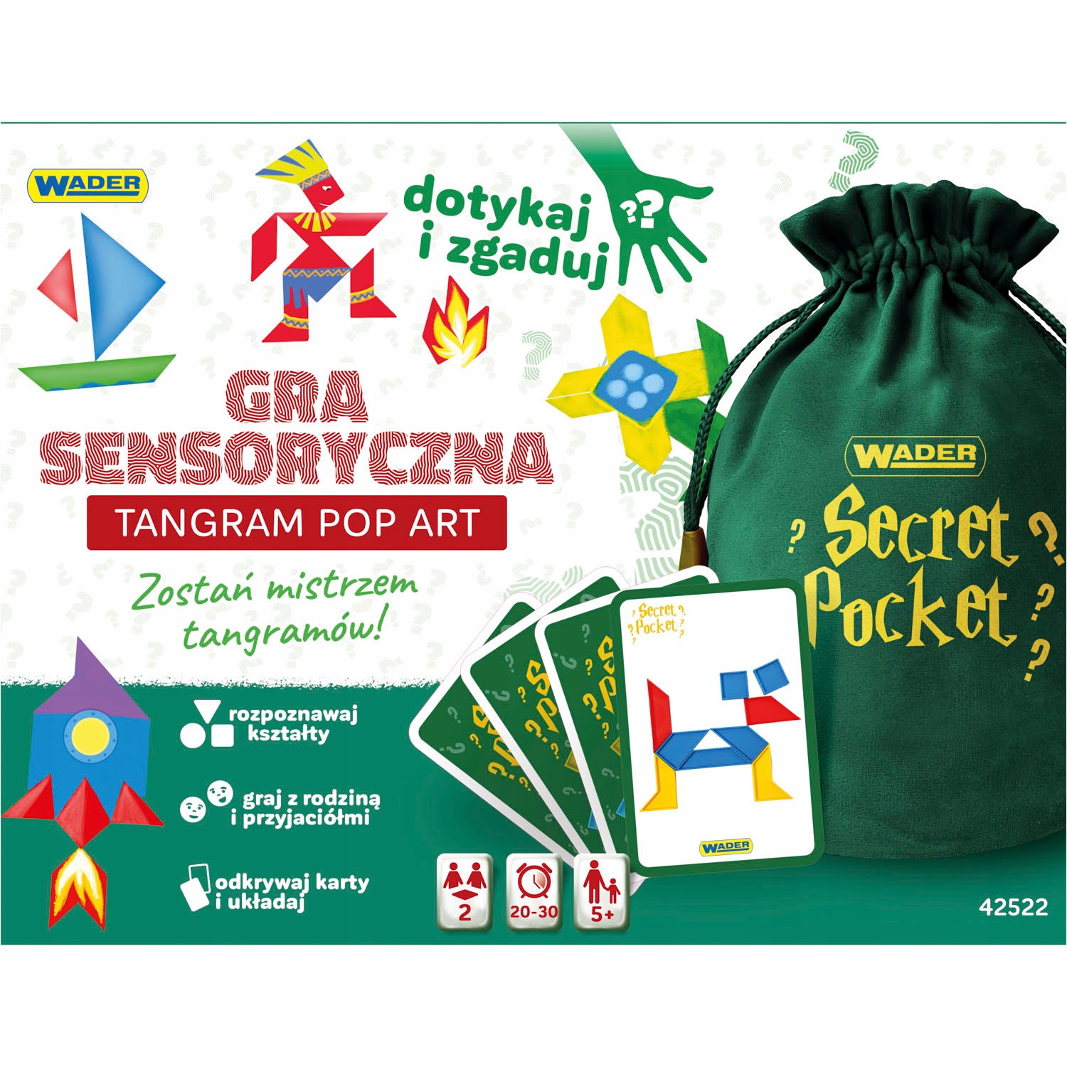 <р> Сенсорные игры, то есть игры, влияющие на осязание, зрение или слух детей и стимулирующие их физическое и умственное развитие. <р> Преимуществом сенсорных игр от Wader является их простота, интересная концепция, высокое качество отдельных элементов игрушки и привлекательное графическое оформление. <р> Игра Танграм Поп Арт создана по образцу знаменитых головоломок типа Танграм, которые уже много веков увлекают детей и взрослых, развивая нейронные связи в мозгу и доставляя массу удовлетворения от достигнутого эффекта. <р> Хотя игра состоит из двух этапов-вариантов и в нее можно играть разными способами, ее основная цель — расположить танграм по рисунку, показанному на вытянутой карте. В наборах игроки найдут элементы танграма, изготовленные из высококачественного пластика, а также карты со множеством красочных и вдохновляющих узоров-головоломк, то есть форм растений, животных, зданий, транспортных средств и людей. Выбирайте тему, рисуйте карточки, ищите правильные элементы, расставляйте узоры и станьте мастером Танграма! <р> игровые элементы, которые после игры можно расположить или использовать согласно идеям, подсказанным вашим воображением <р> простая, но уникальная идея игры, которая влияет на развитие детей <р> качество изготовления - качественный материал, отсутствие острых краев, долговечность изделия, яркие цвета <р> В игре есть два варианта игрового процесса, что делает игру более привлекательной <р> привлекательная и современная упаковка с окошком <р> подходит для детей от 5 лет <р> Образовательно-развивающая ценность игры <р> Сенсорные игрушки учат детей правильно реагировать на раздражители, поступающие к ним из окружающей среды через органы чувств, и расширяют мир впечатлений ребенка <р> игра стимулирует творчество и воображение <р> усиливает способность концентрироваться <р> успокаивает и расслабляет <р> тренирует пространственное воображение <р> Что включено? <р> 1 Secret Pocket - бархатный мешочек для рисования и отгадывания фигур, представленных на картах <р> 40 деталей пазла разной формы и цвета <р> 2 лотка для выкроек <р> 2 колоды ФОРМ и 2 карты ФОРМ, 1 колода ART COMPOSITORS и 1 колода TANGRAM MASTER <р> инструкции <р>Индивидуальная упаковка 39,5 х 29,5 х 7,0 см 0,33 кг Закрытая коробка Массовая упаковка 40,0 x 31,0 x 40,0 см, 0,074 м³ 5,16 кг Закрытый ящик 8