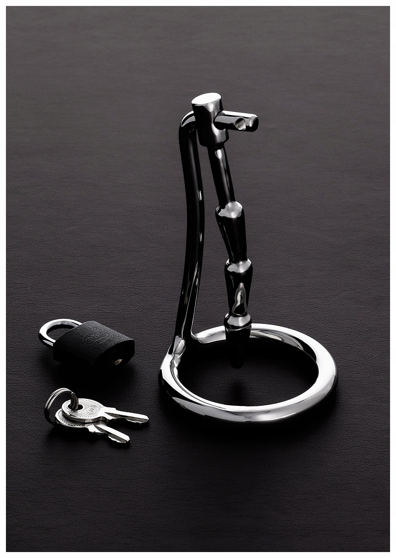 из нержавеющей стали и красиво изогнутая с тремя ударами и коническим пенис -штекальницей с коклингом. Вы можете заблокировать его с помощью прилагаемого замка. Уникальная комбинация в форме, которая предотвращает эрекцию.