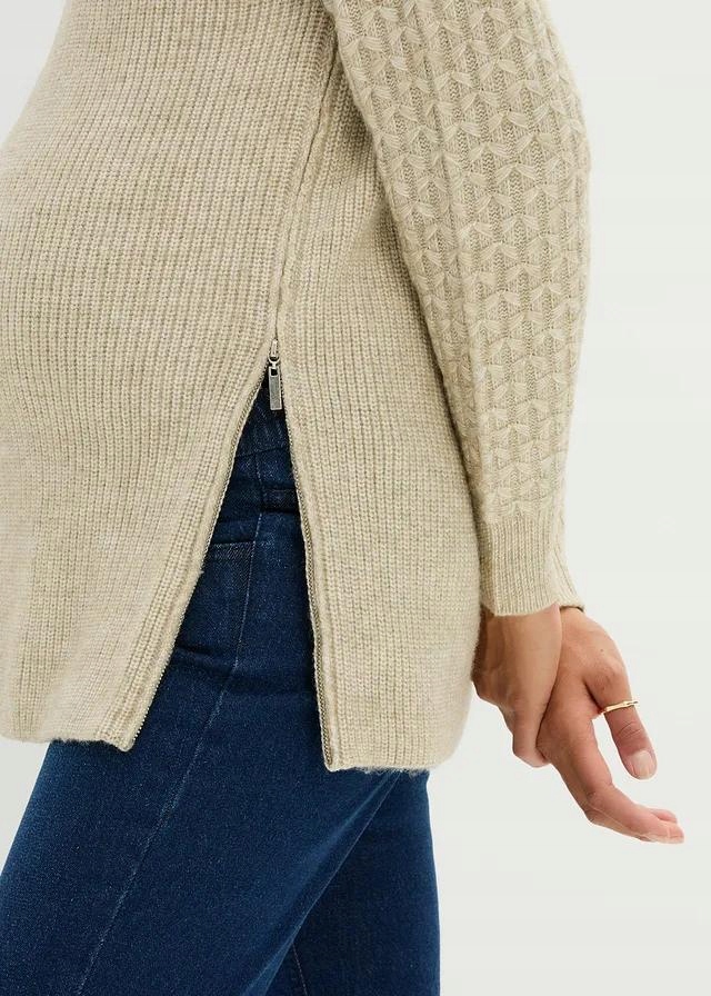 48 _in Свитер беременности с бежевым плетением, несчастным по бокам